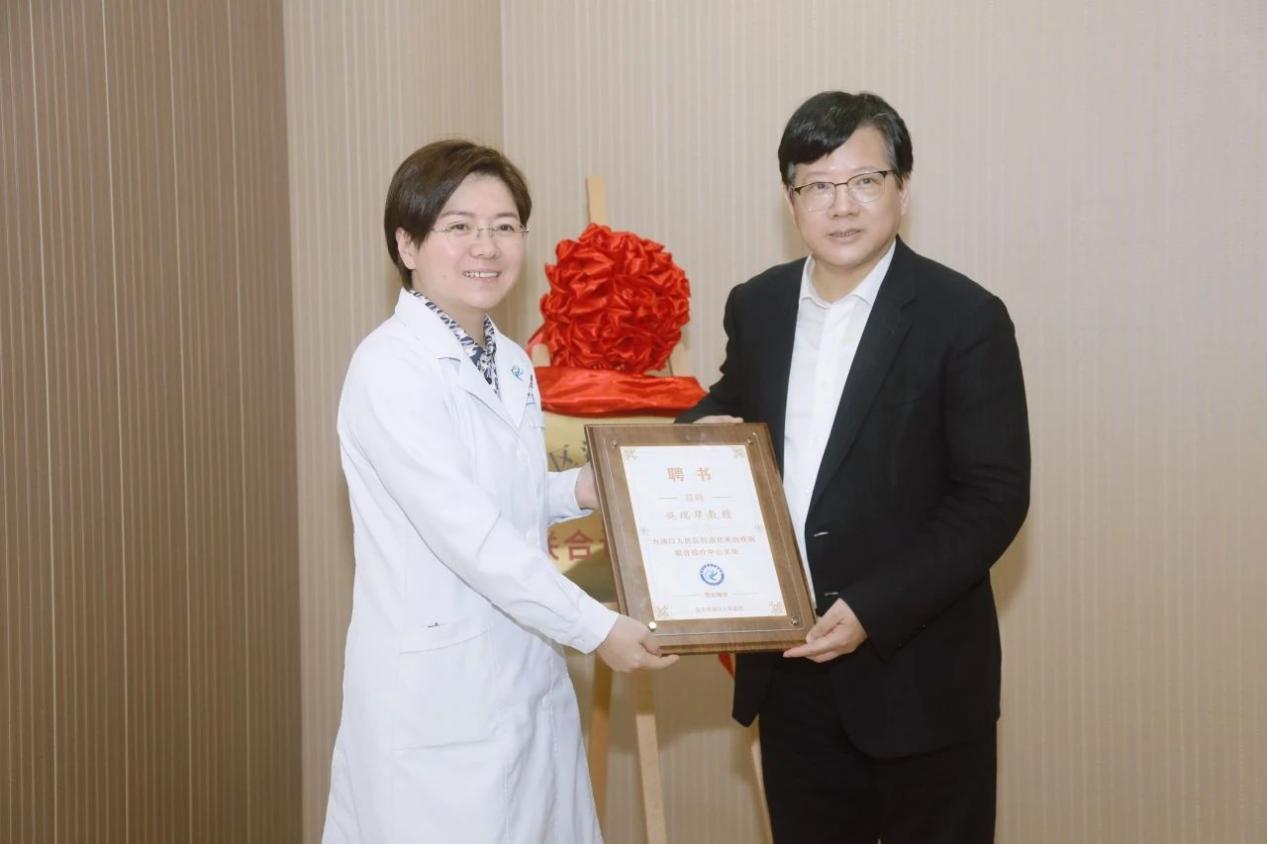 浦口人民医院党委书记张文静为施瑞华教授颁发浦口区消化系统疾病联合诊疗中心主任聘书。