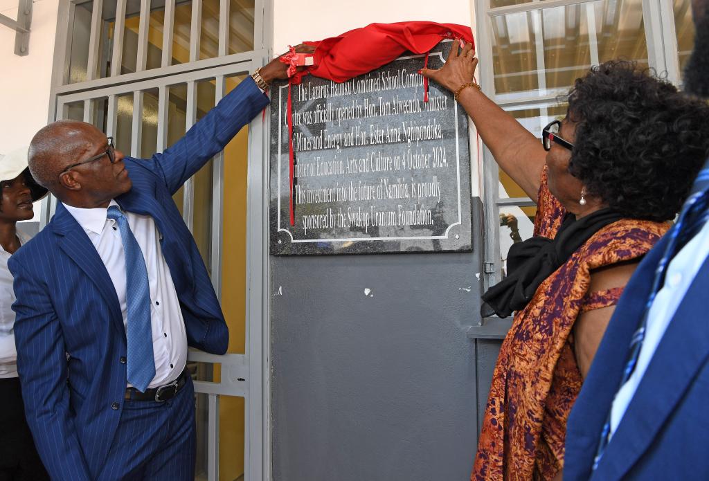 2024年10月4日,在纳米比亚北部奥汉圭纳省拉扎勒斯·豪菲库联合学校,纳教育、艺术与文化部长安娜·恩吉蓬多卡(右)为中国企业捐赠的计算机教室揭幕。新华社记者陈诚摄