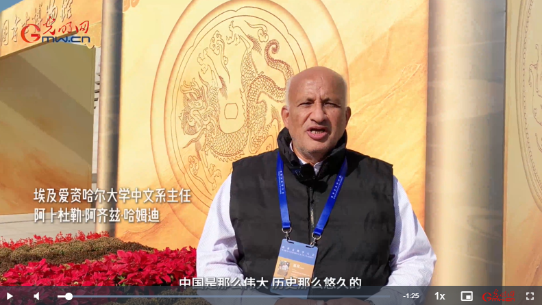 大会期间,埃及爱资哈尔大学中文系主任阿卜杜勒•阿齐兹•哈姆迪在接受光明网采访时为中国坚持文化交流、文明对话点赞。他表示中国文化好像是一条河,从没有中断,给中国人民、给全人类光明的未来。