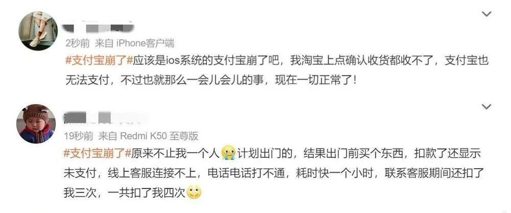 部分网友反映支付宝App无法正常使用,有网友称遇到了同一笔订单被扣款多次、支付后商家未收到款项但银行卡已被扣款等问题。