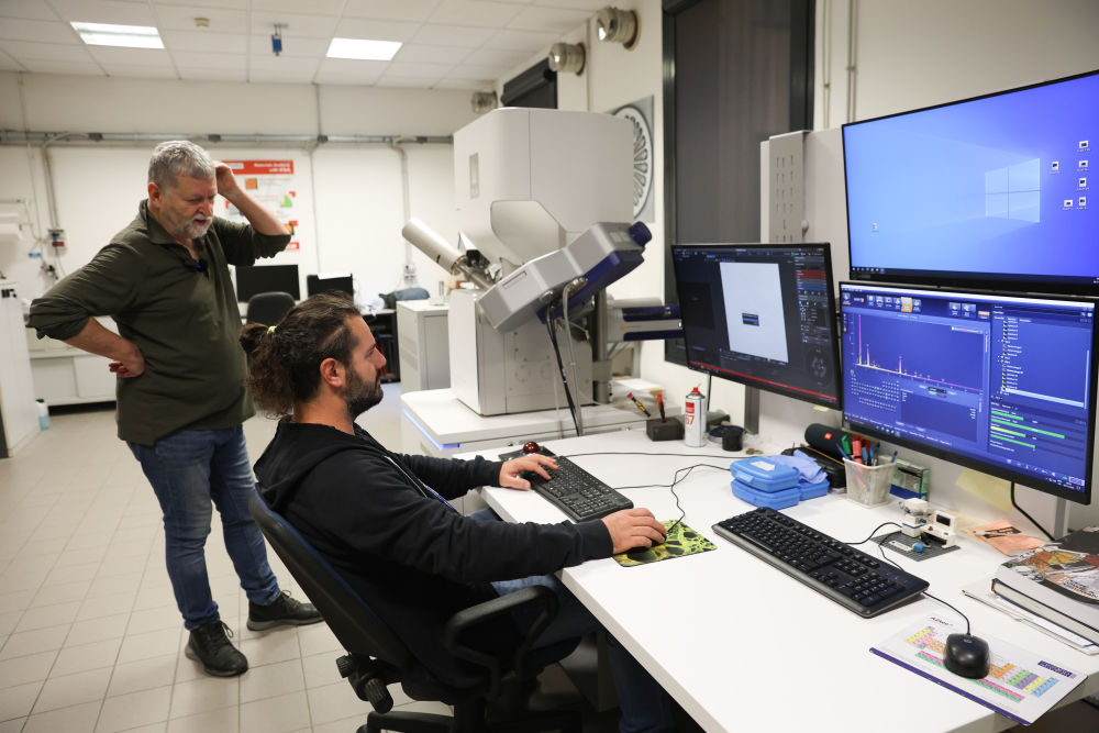 11月6日,意大利帕多瓦大学文化遗产学院教授马西莫·维达莱(左)与研究人员在实验室讨论青铜狮样本检测分析过程。新华社记者李京摄
