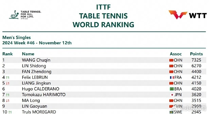 男单,王楚钦以7325分位列男单第一,上周法兰克福站冠军林诗栋位列第二,八个有效积分四个被赋0的樊振东位居第三。