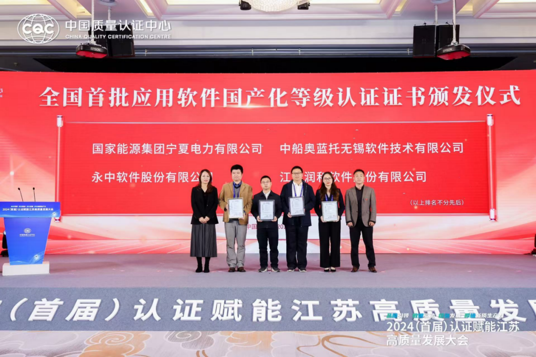 新华日报财经讯 11月12日,中国质量认证中心在南京召开“2024(首届)认证赋能江苏高质量发展大会”。会上,中国政府采购网总编辑郭先旗、江苏省软件行业协会副秘书长夏冰莹为全国首批“应用软件国产化等级认证”颁发证书,国家能源集团宁夏电力有限公司、中船奥蓝托无锡软件技术有限公司、永中软件股份有限公司、江苏润和软件股份有限公司四家企业成为全国首批应用软件国产化等级认证获证企业。
