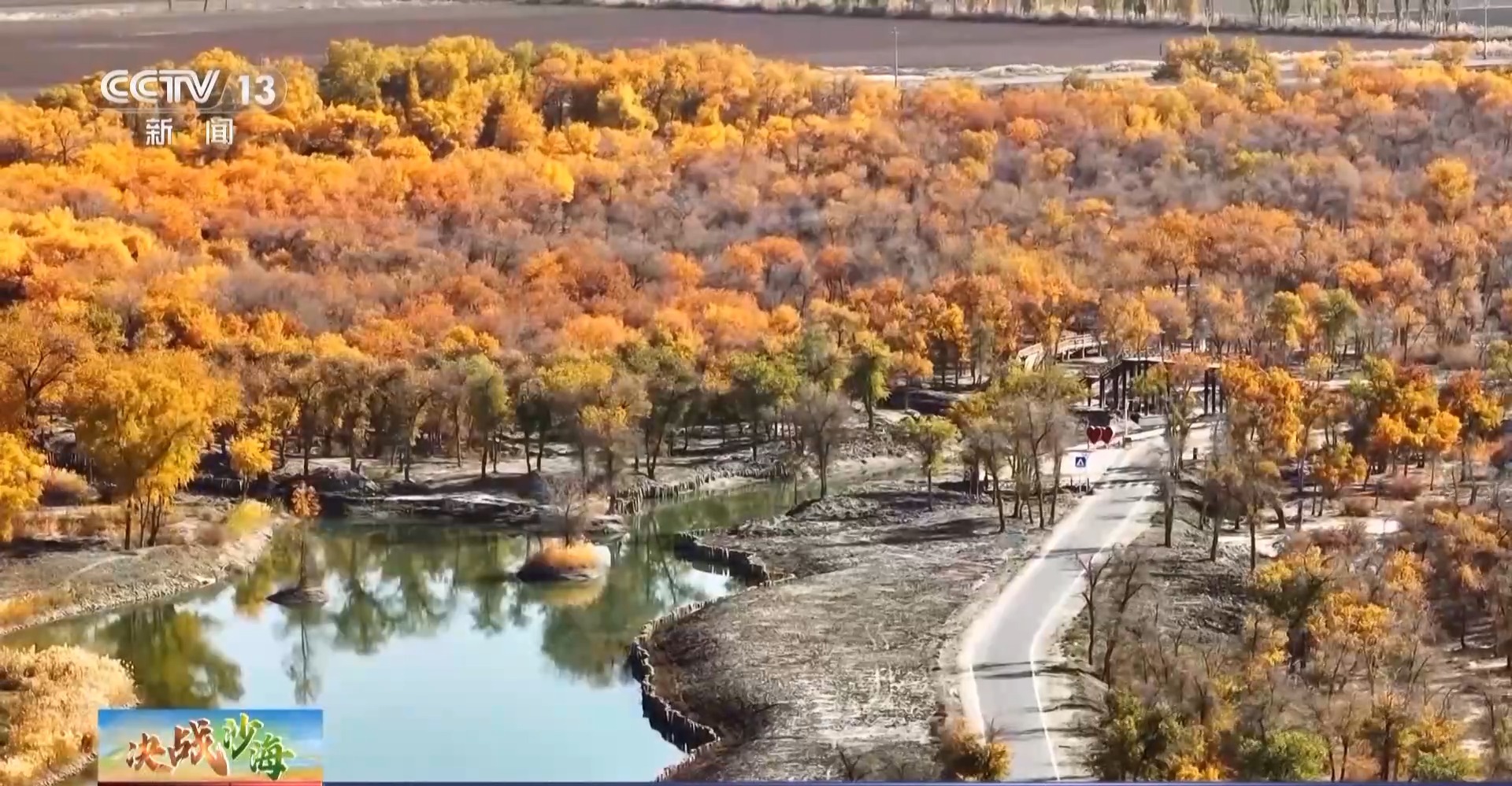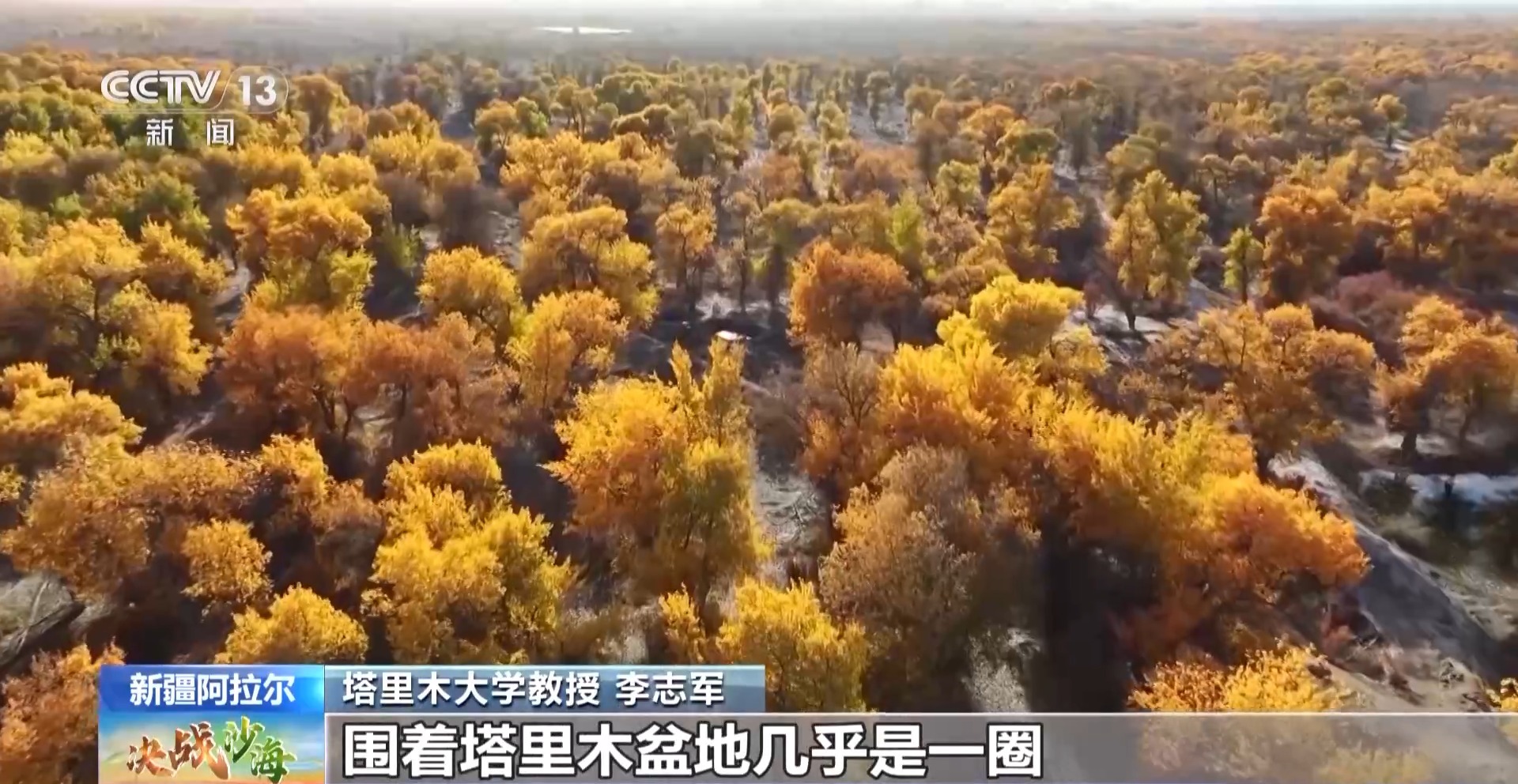塔里木大学教授 李志军:中国91%的胡杨分布在新疆,91%的新疆的胡杨,有89%又分布在塔里木盆地。它们就在沙漠的外围形成了一片绿洲,围着塔里木盆地几乎是一圈。这一圈分布对塔里木盆地整个南疆区域的经济发展、人们生活的生态安全起着极其重要的作用。