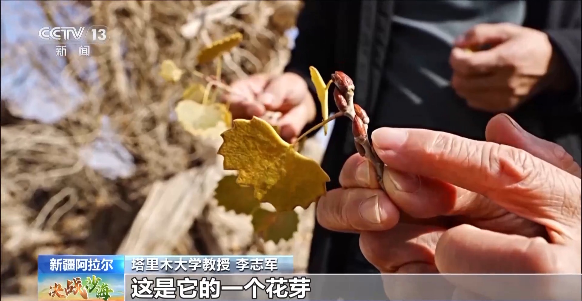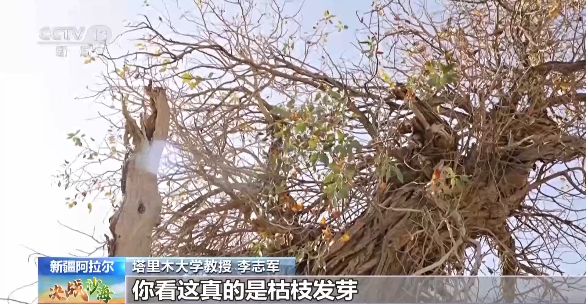 塔里木大学教授 李志军:这是它的一个花芽,说明它明年可以开花结果,它就可以繁殖后代,这也是输水拯救胡杨的终极目标,就是一定让它恢复到它能够自我繁衍。