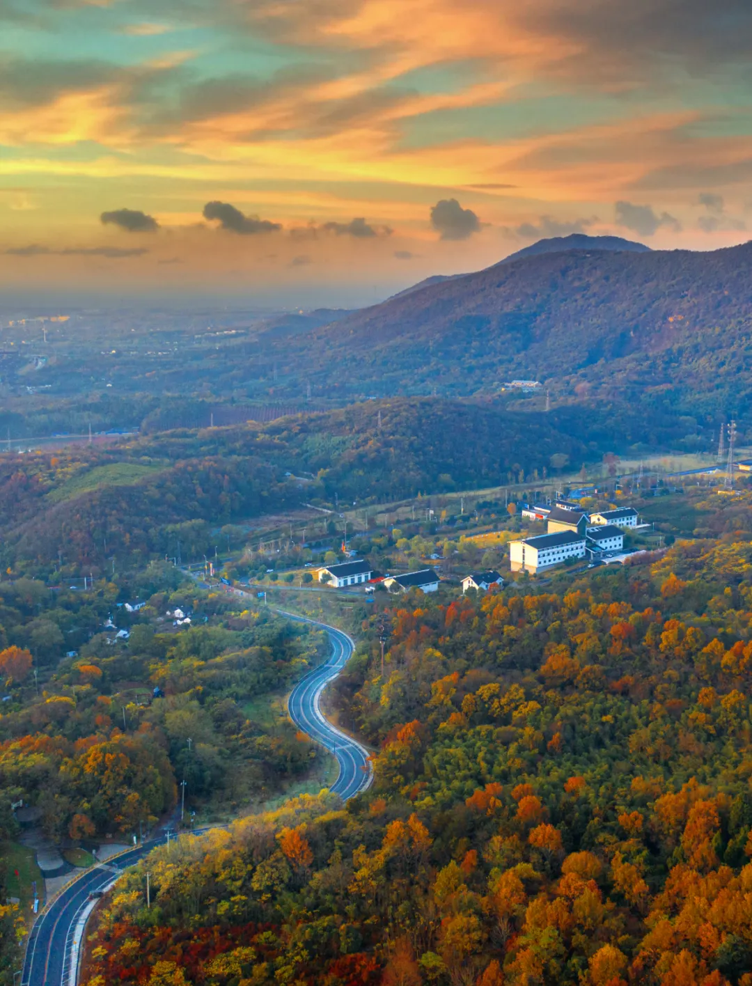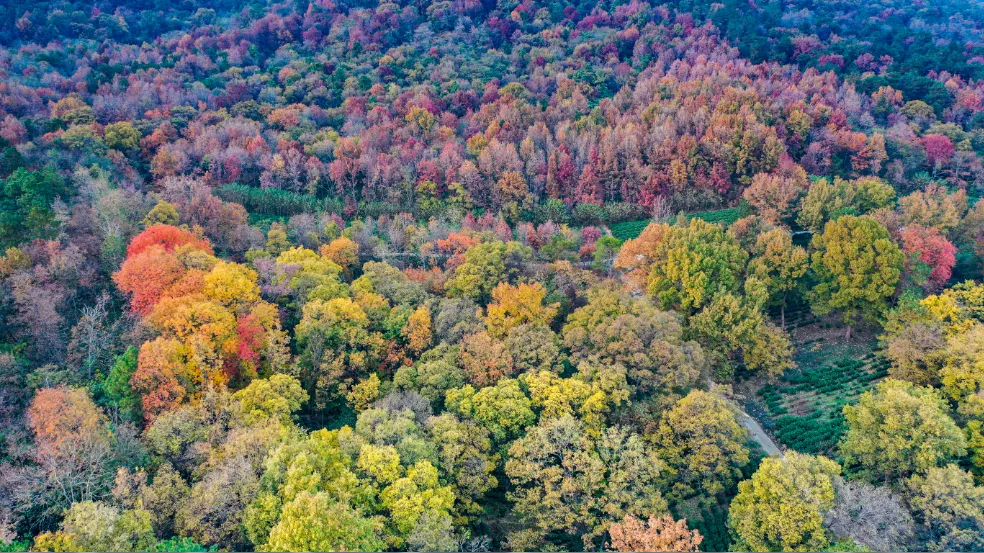 秋季的老山被五彩斑斓的颜色所装点,枫叶如火焰般燃烧,红得热烈奔放;银杏叶似黄金般闪耀,黄得璀璨夺目;松柏依然翠绿,在万紫千红中坚守着自己的一抹绿色。