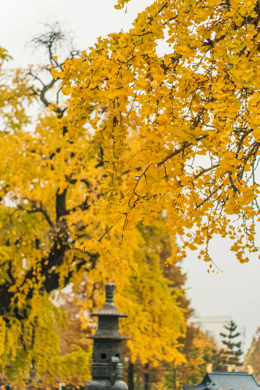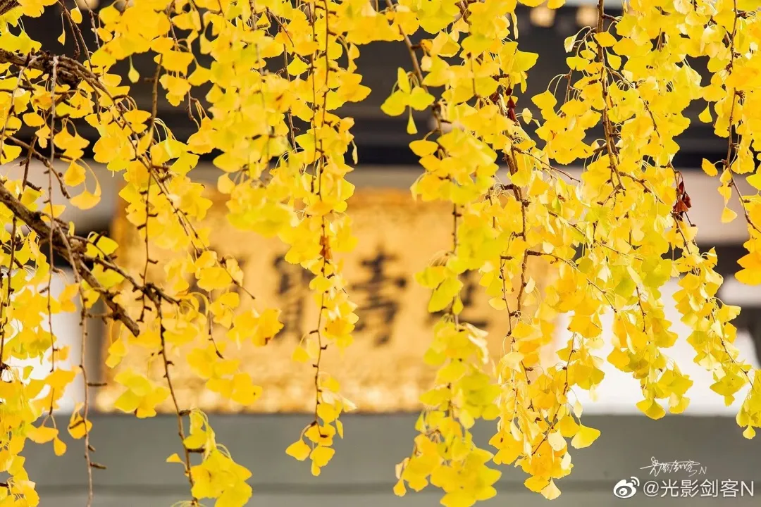 古银杏与古寺相互映衬,构成了一幅宁静而美丽的画面。在古树下品茶沉思,享受片刻的宁静与安逸。