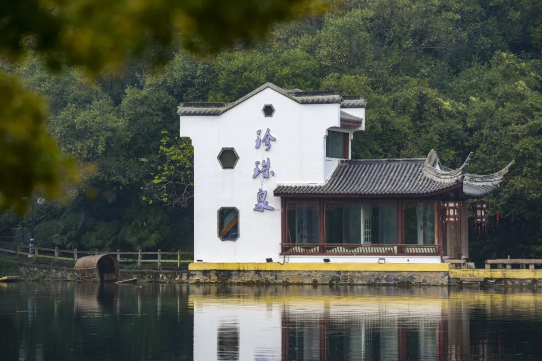 沿着水中汀步,缓缓走上龙舟画舫,人在景中游,画面静谧美好。