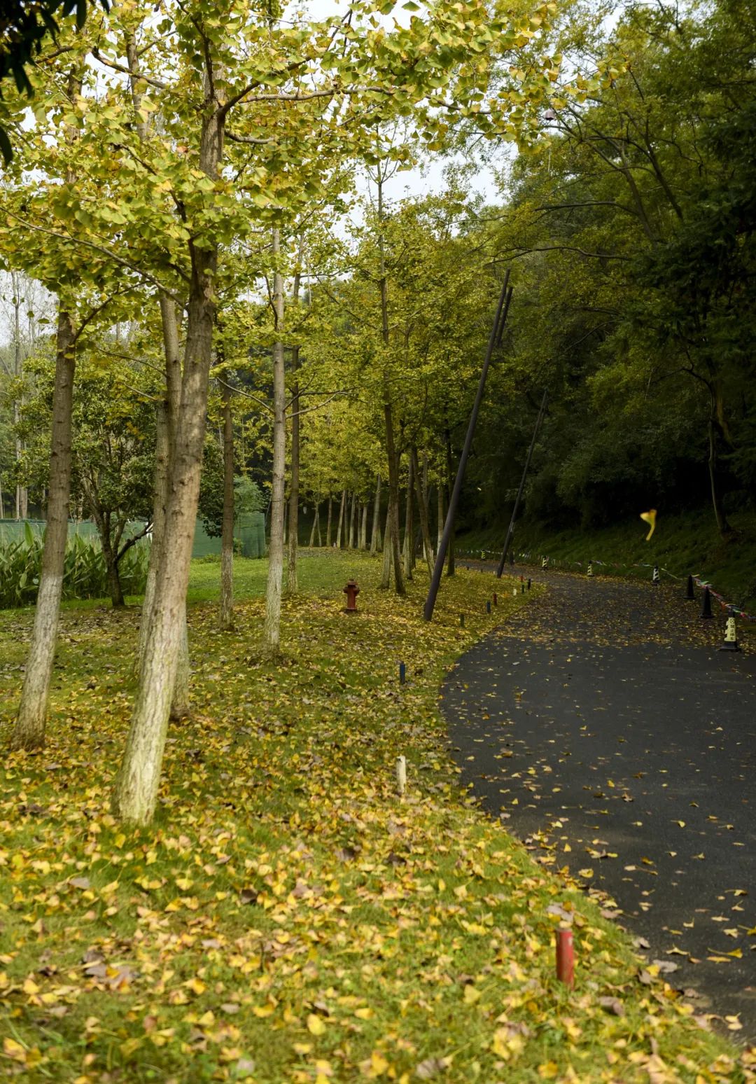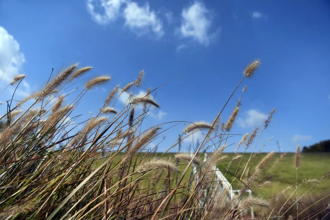 天空湛蓝,黄叶满地、肆意的狼尾草,浓浓秋色为作品加分。