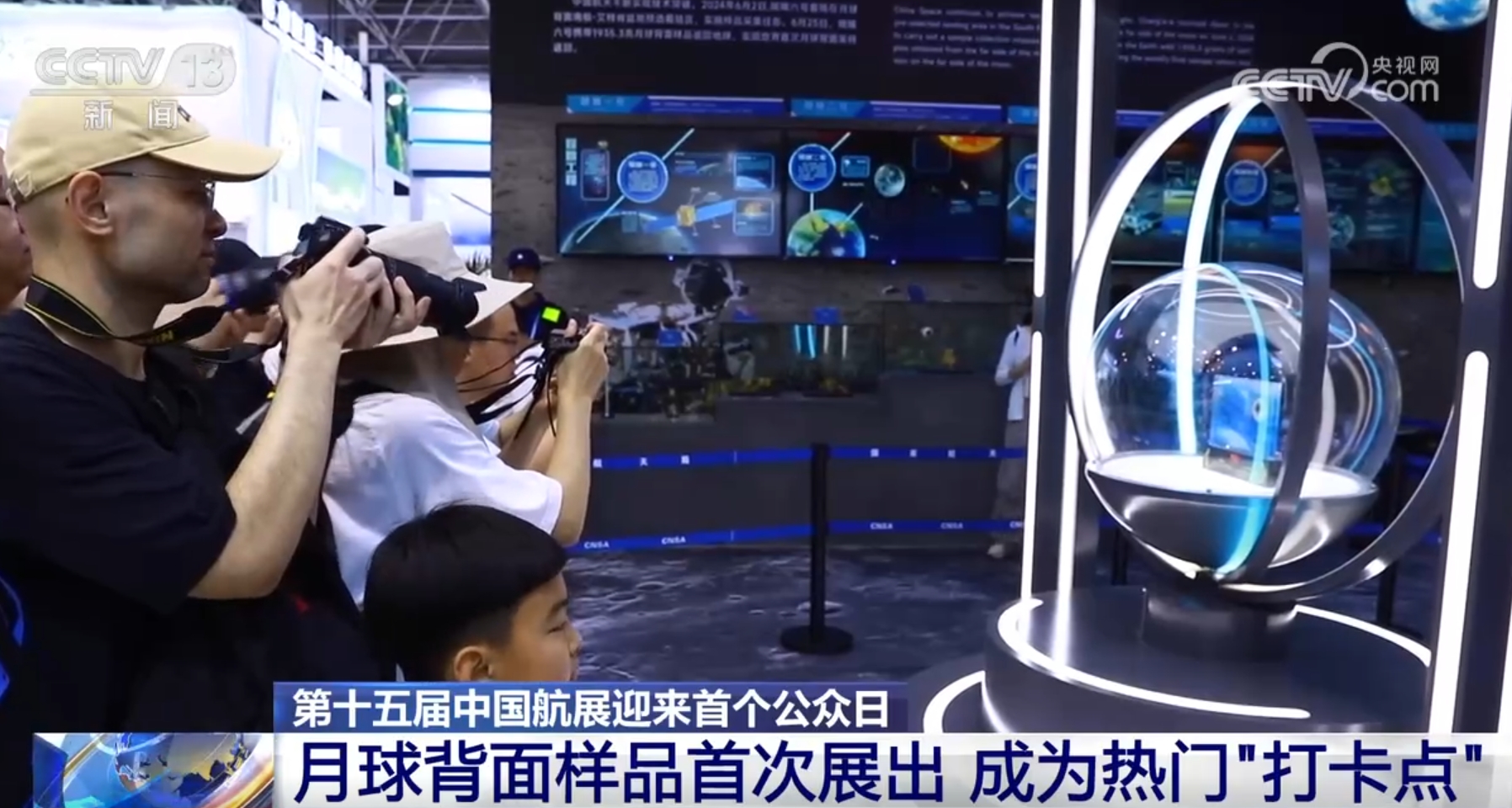 场馆内,多个展台的首发首秀产品成了大家的热门“打卡点”。其中,首次展出的由嫦娥六号取回的月球背面样品则是名副其实的场内“焦点”。