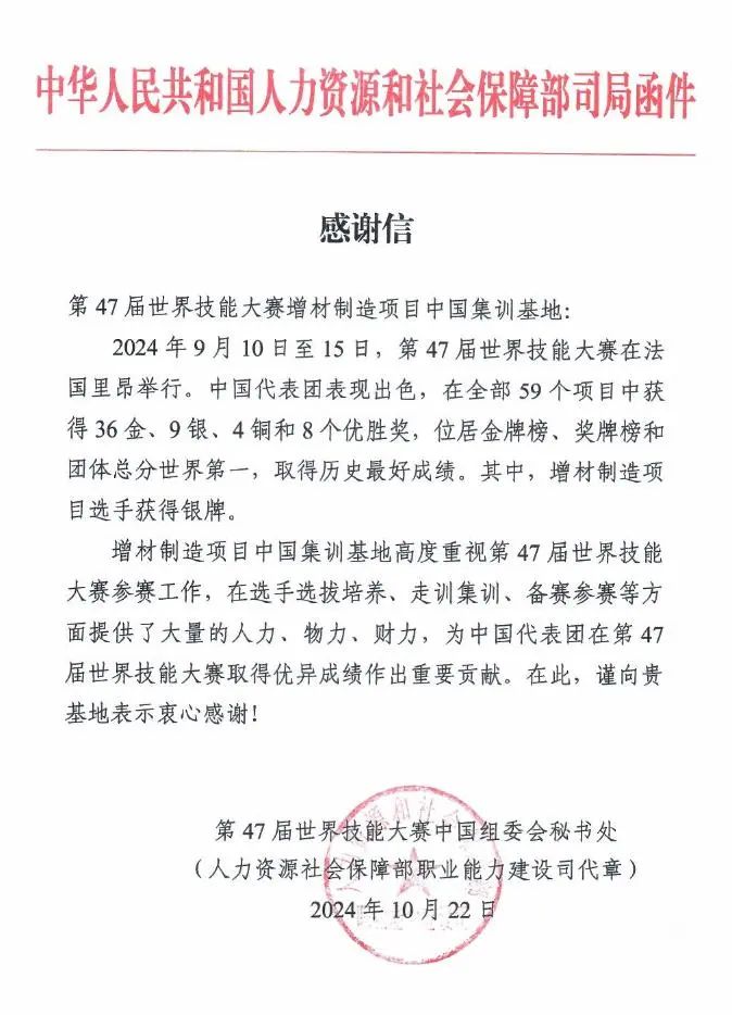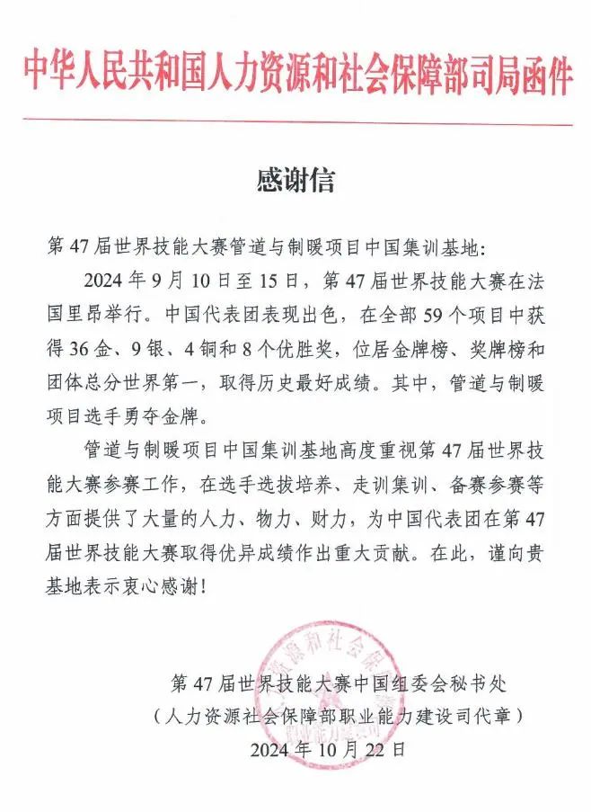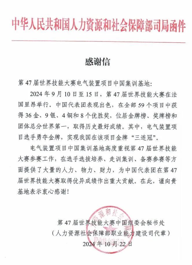 新华报业网讯 近日,国家人力资源社会保障部职业能力建设司第47届世界技能大赛中国组委会秘书处,分别向荣获第47届世界技能大赛荣获金牌的电气装置、管道与制暖项目,荣获银牌的增材制造项目等3个中国选手集训基地发来感谢信,感谢3个集训基地在选手选拔培养、走训集训、备赛参赛方面提供的支持,以及为中国代表团取得优异成绩作出的重大贡献。