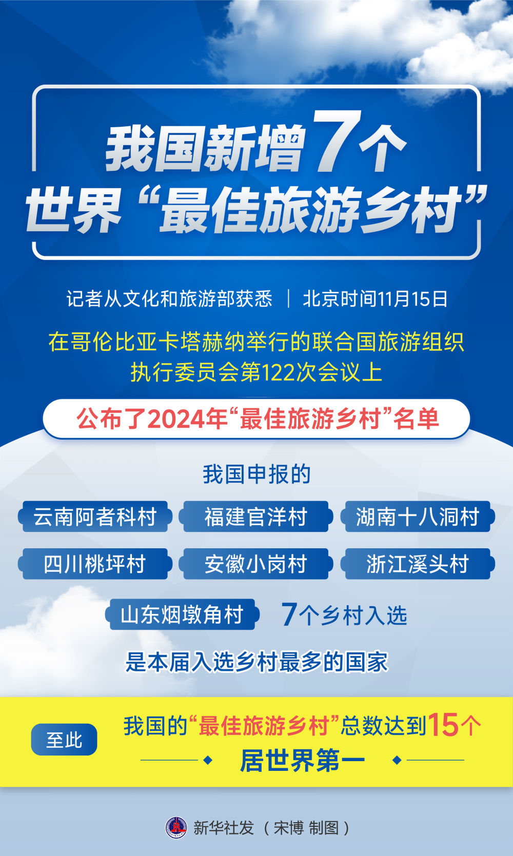 北京时间11月15日,在哥伦比亚卡塔赫纳举行的联合国旅游组织执行委员会第122次会议上公布了2024年“最佳旅游乡村”名单。我国申报的7个乡村入选,与此前入选的8个乡村一道,共同成为中国乡村的“世界级代表”。中国也凭借这15个乡村,成为拥有“最佳旅游乡村”总数最多的国家。(新华社)