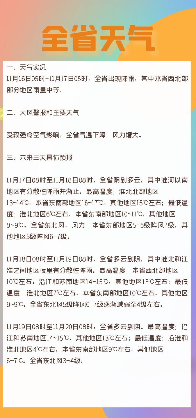 【受较强冷空气影响,全省气温下降,风力增大】11月17日08时至11月18日08时,全省阴到多云,其中淮河以南地区有分散性阵雨并渐止。最高温度:淮北北部地区13~14℃,本省东南部地区16~17℃,其他地区15℃左右;最低温度:淮北地区6℃左右,本省东南部地区10~11℃,其他地区8~9℃。(@江苏气象)