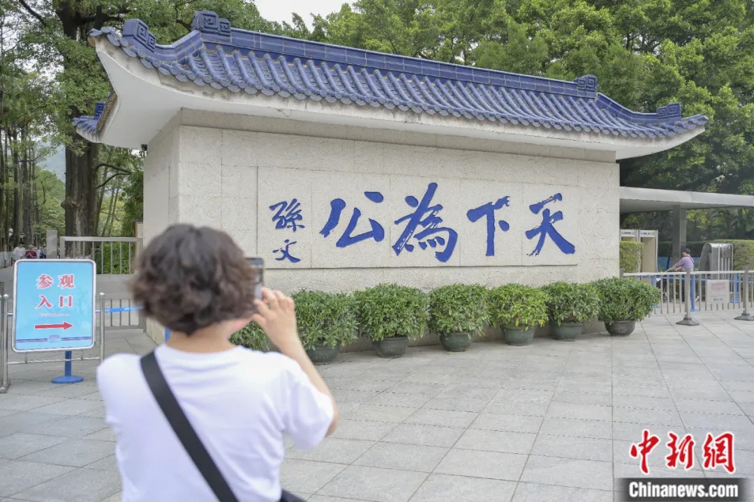 2024年3月30日,孙中山故居纪念馆外正门处的“天下为公”石碑吸引游客。中新社记者 陈骥旻 摄