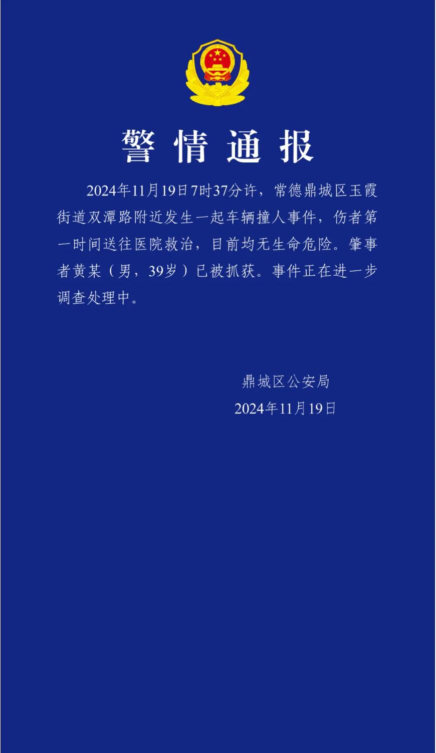 今日下午,湖南常德市鼎城区公安局发布警情通报:11月19日7时37分许,常德鼎城区玉霞街道双潭路附近发生一起车辆撞人事件,伤者第一时间送往医院救治,目前均无生命危险。肇事者黄某(男,39岁)已被抓获。事件正在进一步调查处理中。