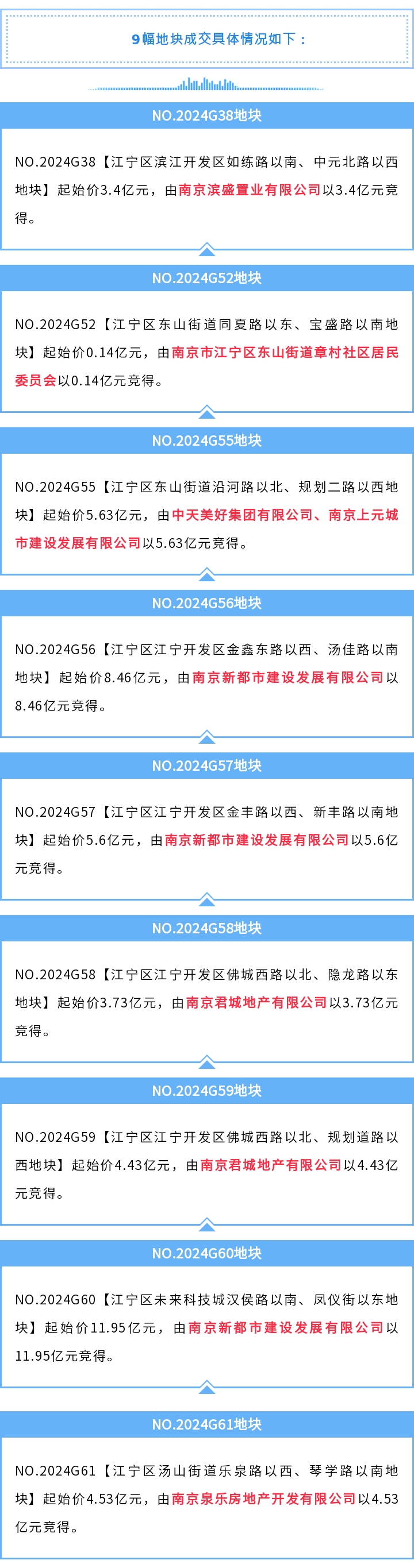 交汇点讯 11月20日,南京宁出第16号公告的9幅经营性用地成交,其中7幅住宅用地、1幅老年公寓用地、1幅社区中心用地。总用地面积约36.4公顷,成交总价47.87亿元。
