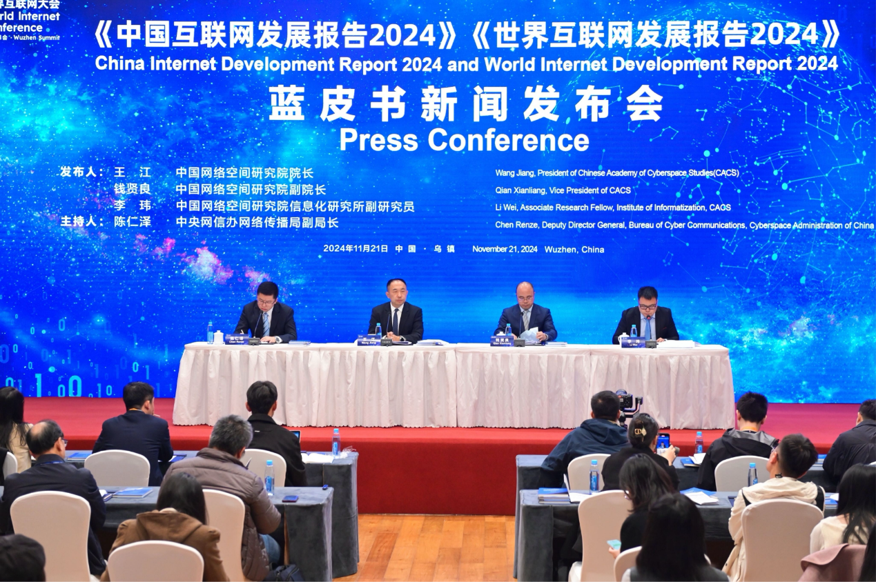 交汇点讯 11月21日,由中国网络空间研究院编写、国内互联网领域高端智库和研究机构支持参与的《中国互联网发展报告2024》和《世界互联网发展报告2024》蓝皮书在2024年世界互联网大会乌镇峰会上正式发布。