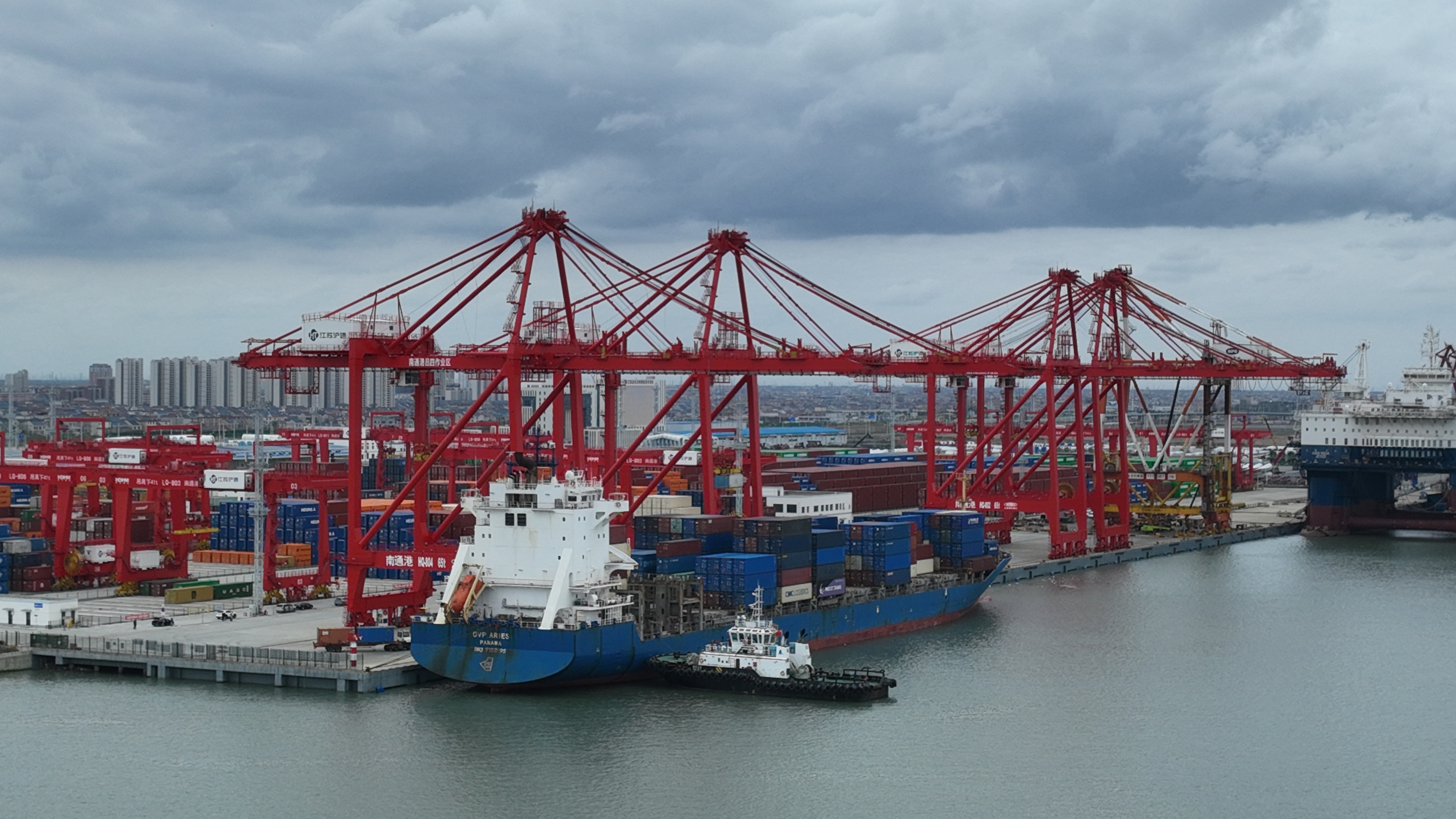 交汇点讯 近日,装载42个重箱的巴拿马籍集装箱船“OVP ARIES”(海液通得祥)轮缓缓驶离通州湾吕四起步港区江苏沪通集装箱码头,标志着南通首条集装箱远洋航线——吕四至北非红海航线班轮正式开通运营。