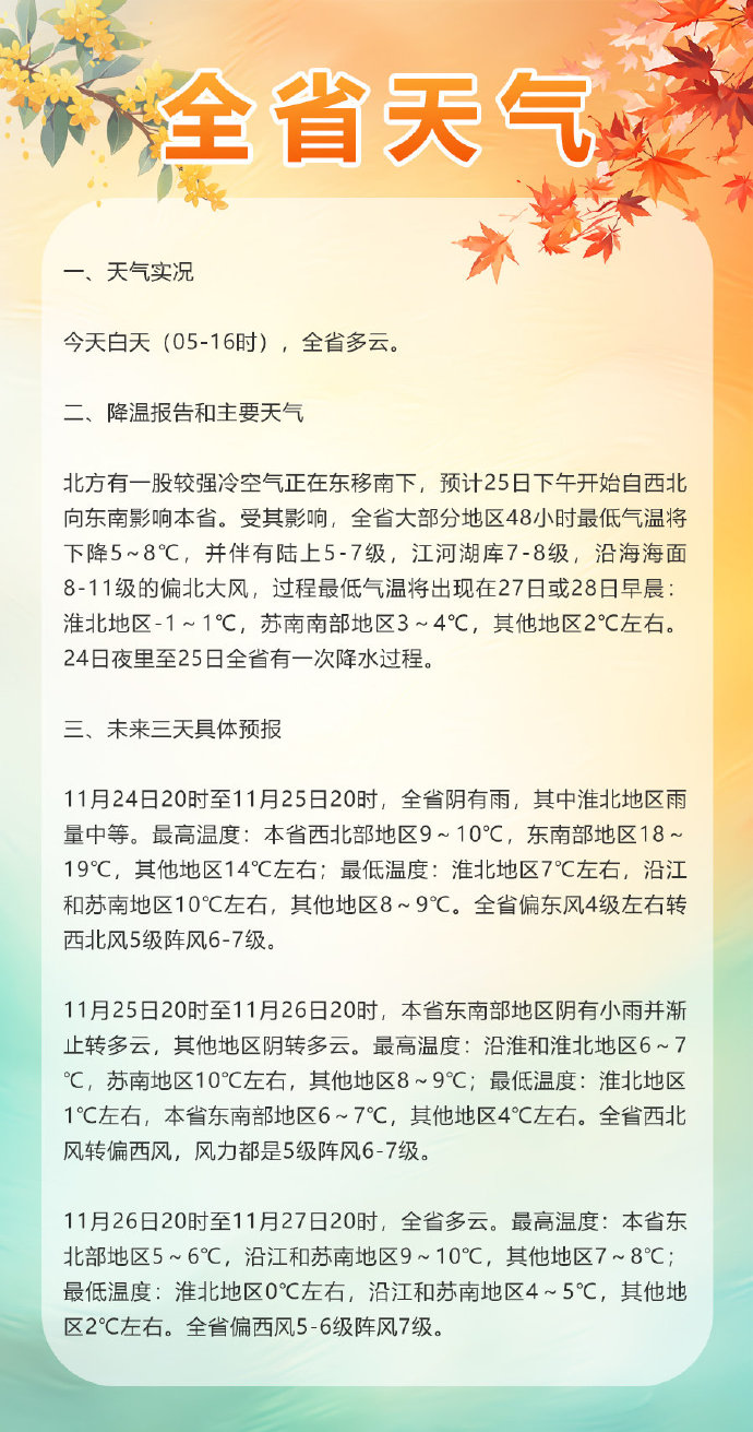 24日夜里至25日全省有一次降水过程。11月24日20时至11月25日20时,全省阴有雨,其中淮北地区雨量中等。最高温度:本省西北部地区9~10℃,东南部地区18~19℃,其他地区14℃左右;最低温度:淮北地区7℃左右,沿江和苏南地区10℃左右,其他地区8~9℃。全省偏东风4级左右转西北风5级阵风6~7级。