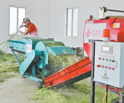 工人使用菌草饲料生产设备对菌草进行粉碎。