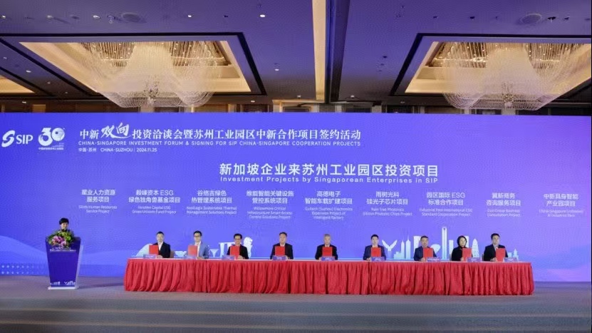 这天,包括新加坡中国商会的一批企业在内,众多来自中新两国的客商齐聚金鸡湖畔,用“真金白银”的项目为园区庆生。在中新双向投资洽谈会暨中新合作项目签约活动上,3批26个中新双向投资合作项目签约。这些项目具有高科技、绿色化等显著特征,涵盖生物医药及联合创新、数字经济、绿色发展、商业服务等领域,代表前沿产业领域的最新成果和发展方向。