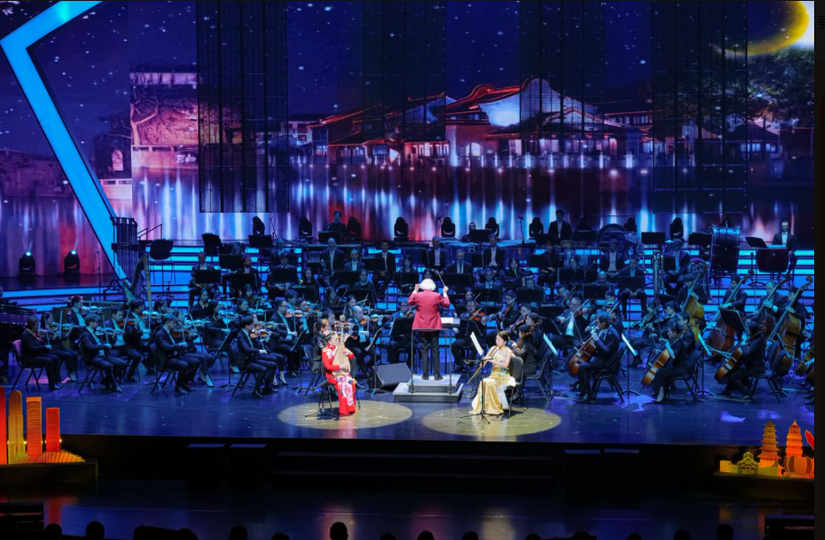 当晚,苏州文化艺术中心大剧院内,一场由中新两国艺术家合作完成的演出带领观众走进浪漫的夜晚。“这场演出我们准备了世界经典名曲、中国经典名曲以及原创诗朗诵这3种类型的曲目,让观众感受到园区在不同发展阶段的历程。”国家一级艺术监督、“中新圆融·交响之夜”演出总导演陈伟说。