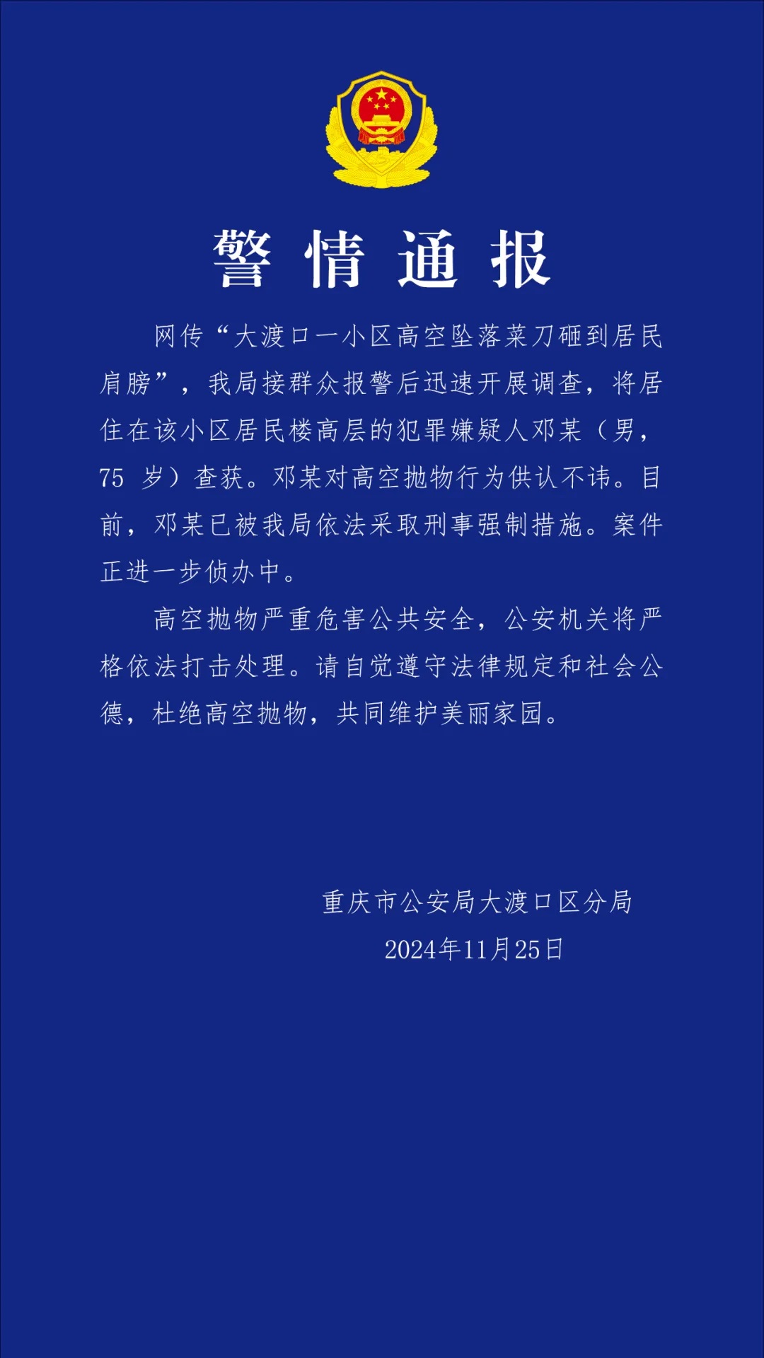 据“平安大渡口”微信公众号消息,重庆市公安局大渡口区分局25日发布警情通报称,网传“大渡口一小区高空坠落菜刀砸到居民肩膀”,该局接群众报警后迅速开展调查,将居住在该小区居民楼高层的犯罪嫌疑人邓某(男,75岁)查获。邓某对高空抛物行为供认不讳。目前,邓某已被该局依法采取刑事强制措施。案件正进一步侦办中。