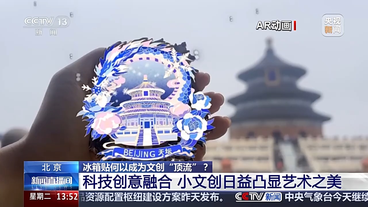 这个冬季元素的AR冰箱贴,设计灵感来自雪后天坛,手机扫描冰箱贴背后的二维码即可观看AR动画,雪中祈年殿就能清晰立体地呈现在眼前。