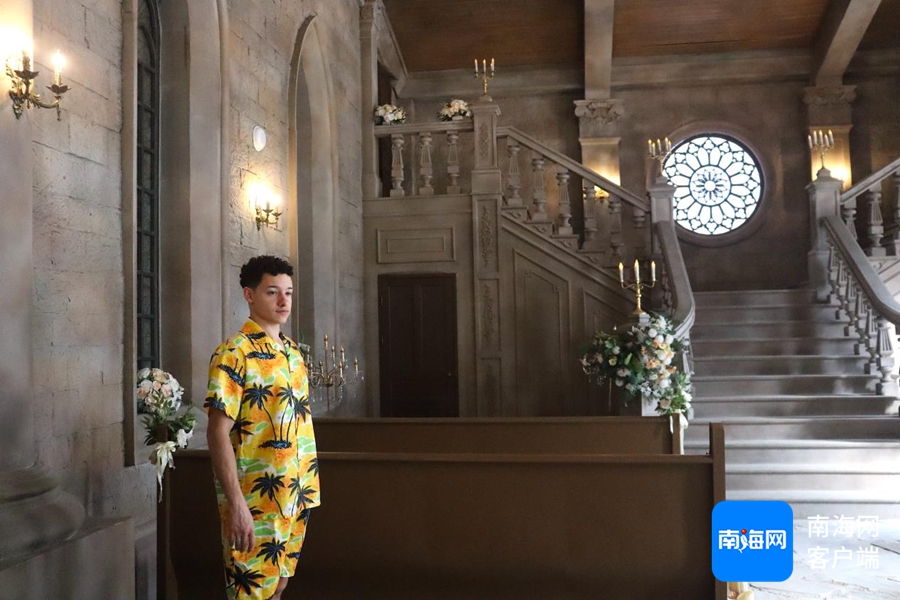 Harvey身着岛服在影视基地打卡拍摄。海南国际传播中心供图
