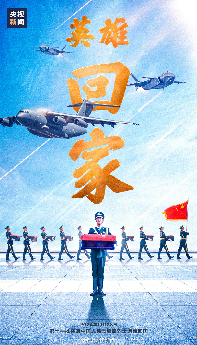今天(11月28日),第十一批在韩中国人民志愿军烈士遗骸迎回仪式将在沈阳桃仙国际机场举行。43位在韩中国人民志愿军烈士遗骸及495件遗物搭乘运-20专机回国。