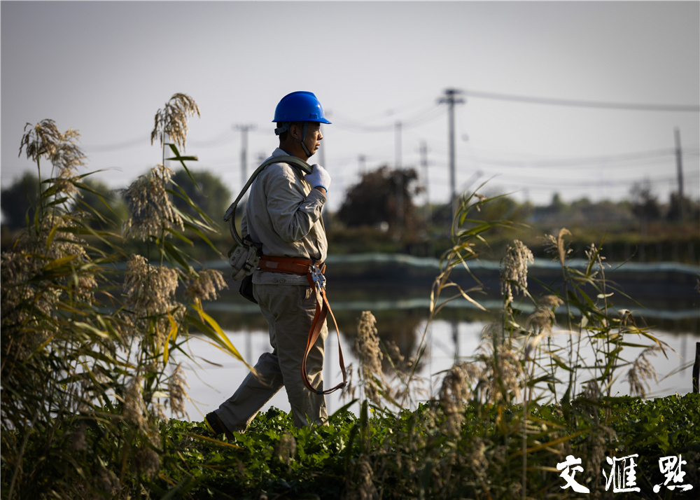 邱兵身背“百宝箱”般的工具包,为圩堤上的电线杆进行定期巡检。无论酷暑严冬,只要电路出现故障,他和同事们总是第一时间赶赴现场,保障渔村的供电,为渔民送去光明与便利。