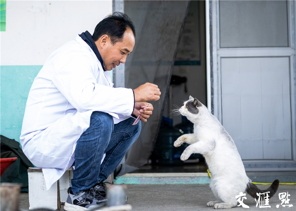 湖区渔民日渐稀少,民众体魄愈发强健,因而王开元医生门前冷落。图为11月4日,王开元闲来投喂爱猫,与之为伴,共度船上时光。