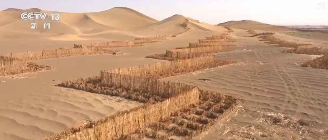 在新疆喀什地区叶城县,草方格沙障连成的“锁边”带不断延展,180米宽的草方格要再加宽60米。