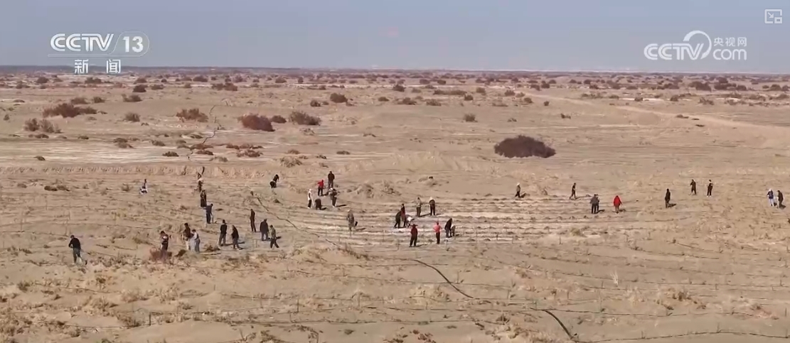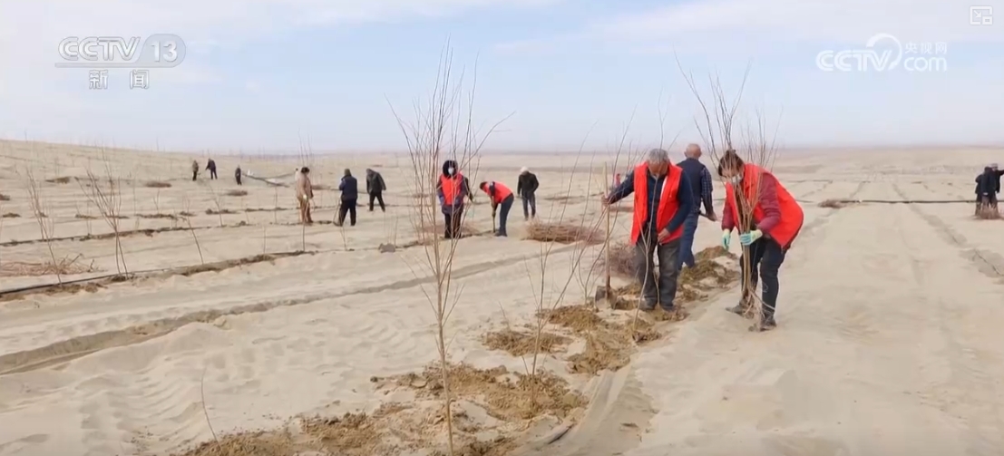 在新疆和田地区于田县阗东沙漠治沙点,当地干部群众正忙着栽种苗木。这里距离“锁边”林带大约500米,补齐空白区后,当地将沿着“锁边”林带,继续向两侧沙漠方向植树造林、扩绿增绿,进一步拓宽“绿色防线”。
