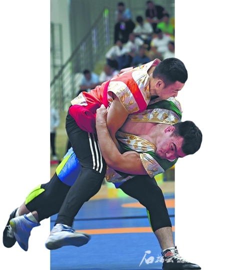 11月27日,新疆代表团运动员亚沙尔·提力瓦力地(右)在民族式摔跤且里西项目74公斤级比赛中获得一等奖。