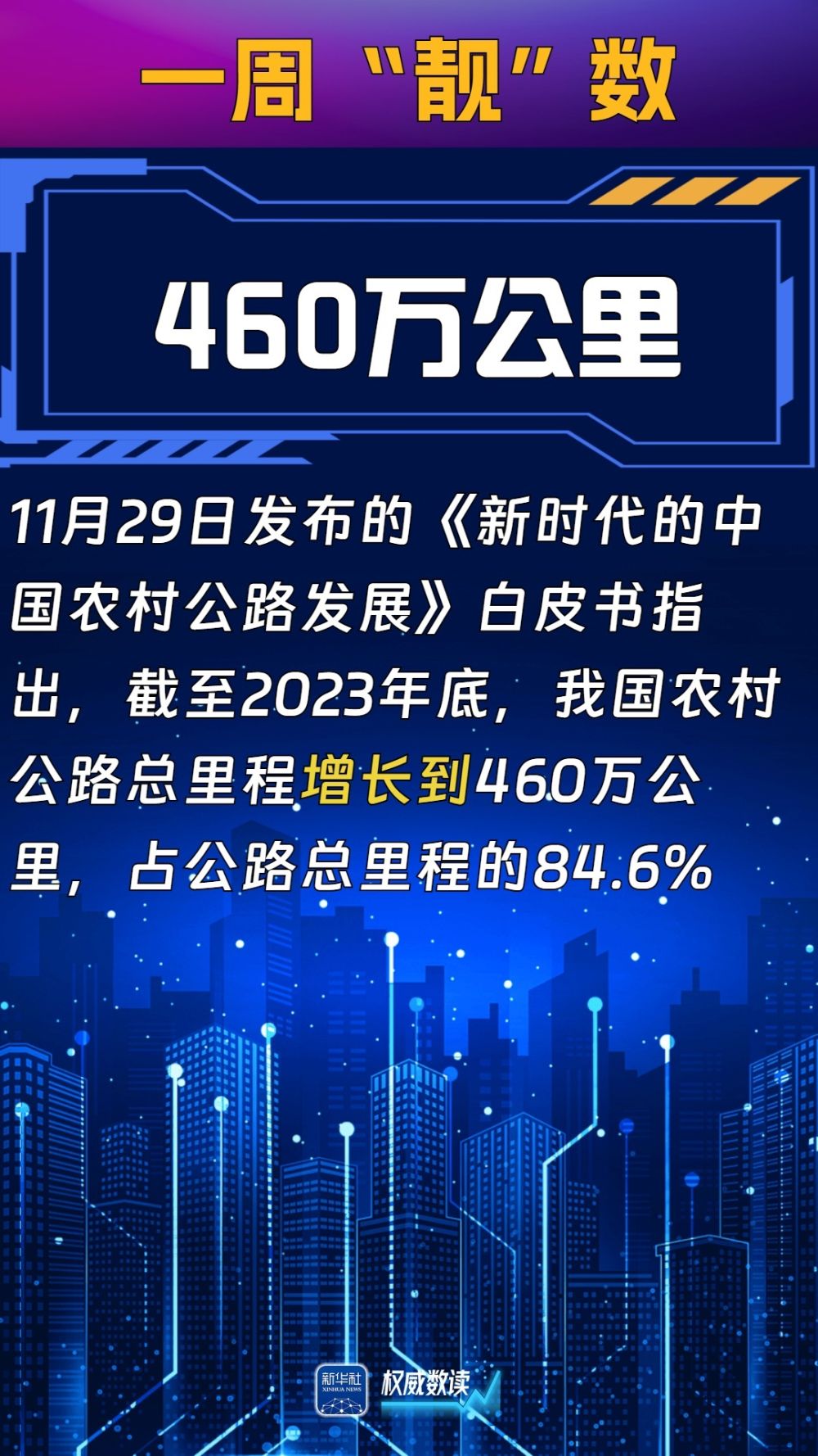 11月29日发布的《新时代的中国农村公路发展》白皮书指出,截至2023年底,我国农村公路总里程增长到460万公里,占公路总里程的84.6%,形成了“外通内联、通村畅乡、客车到村、安全便捷”的农村交通运输网络,带动了农村地区整体面貌发生巨变。
