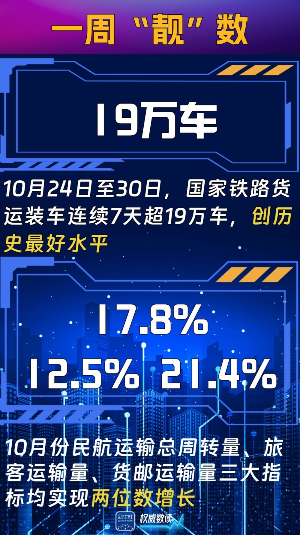 10月份,全国铁路货运发送量4.55亿吨,同比增长4.3%;全国铁路货运周转量3194.46亿吨公里,同比增长0.2%。其中,10月24日至30日,国家铁路货运装车连续7天超19万车,创历史最好水平。