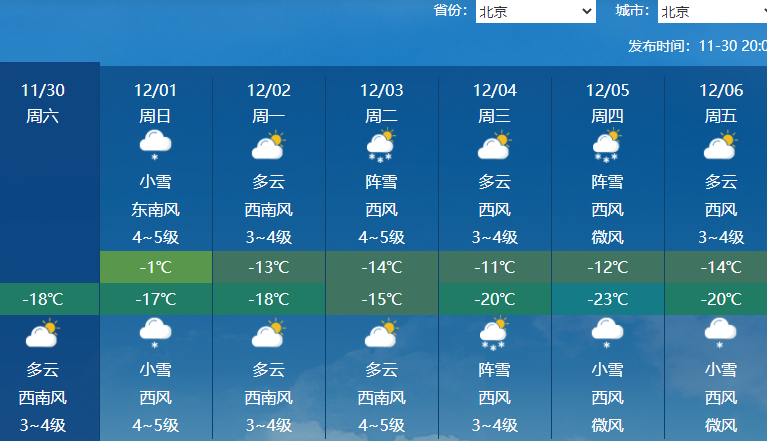明起到下周将有两股冷空气影响我国,分别在12月1日-3日和6-8日。其中12月1日-3日受较强冷空气影响,长江中下游及其以北地区将先后有4-6级风,阵风7-8级,局地可达9级,气温下降4~6℃,其中华北东北部分地方降温8~10℃,局地12℃以上。