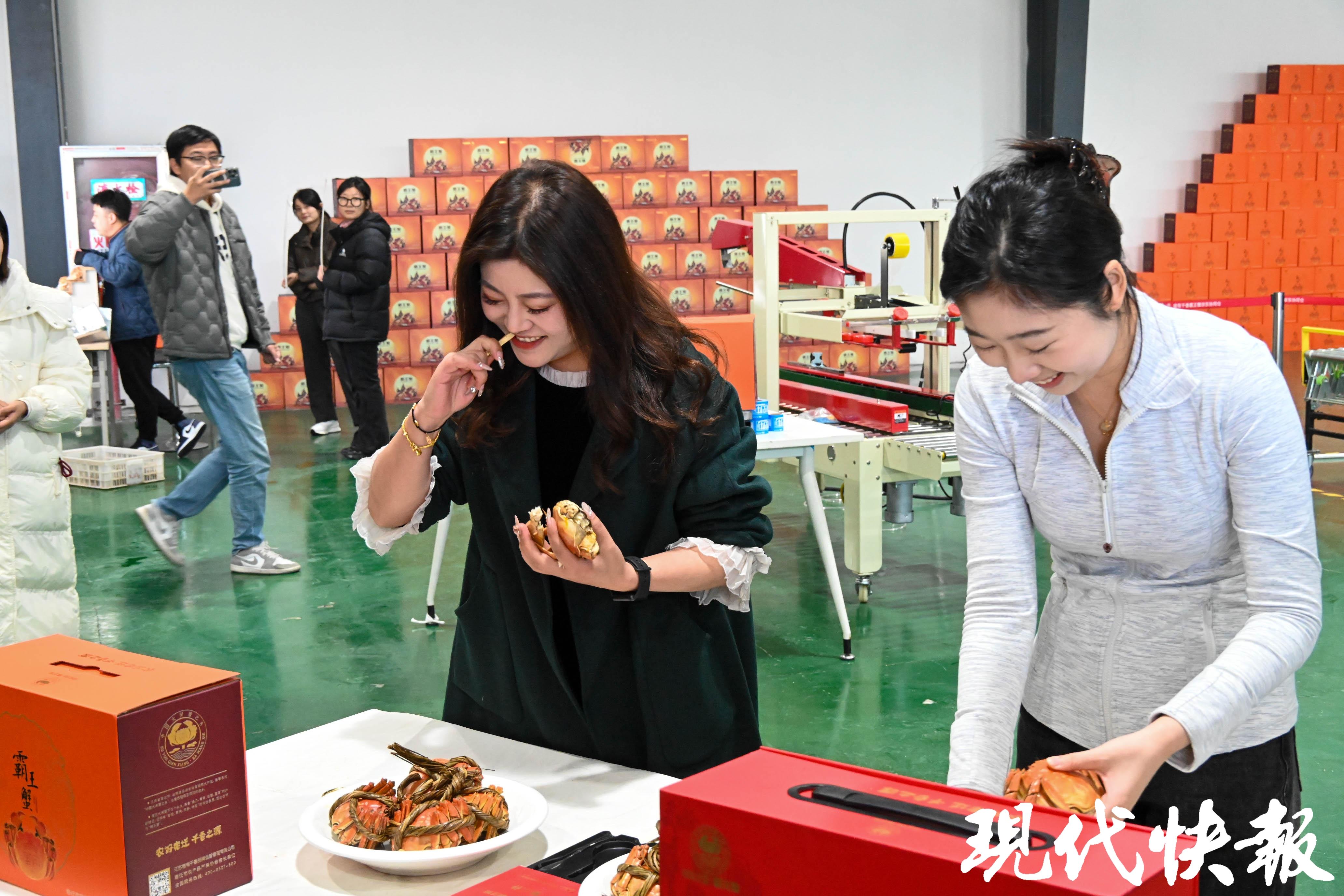 无独有偶,在宿迁市湖滨新区霸王蟹产业发展中心,一家霸王蟹供应链公司的直播间就搭建在霸王蟹包装车间。在这里,从蟹塘捞上来的霸王蟹,经过暂养、分拣、捆扎、包装等环节,搭上冷链物流,48小时内就可以到达全国消费者餐桌。