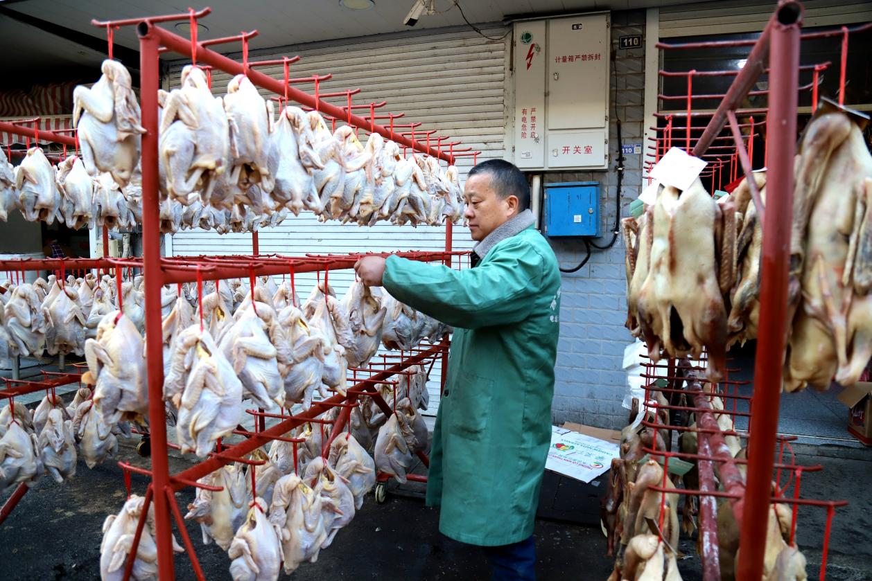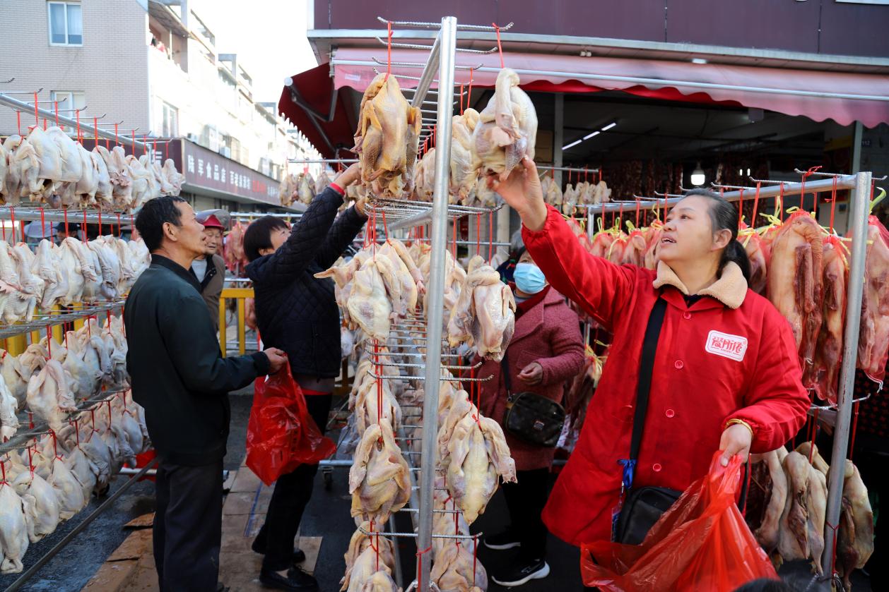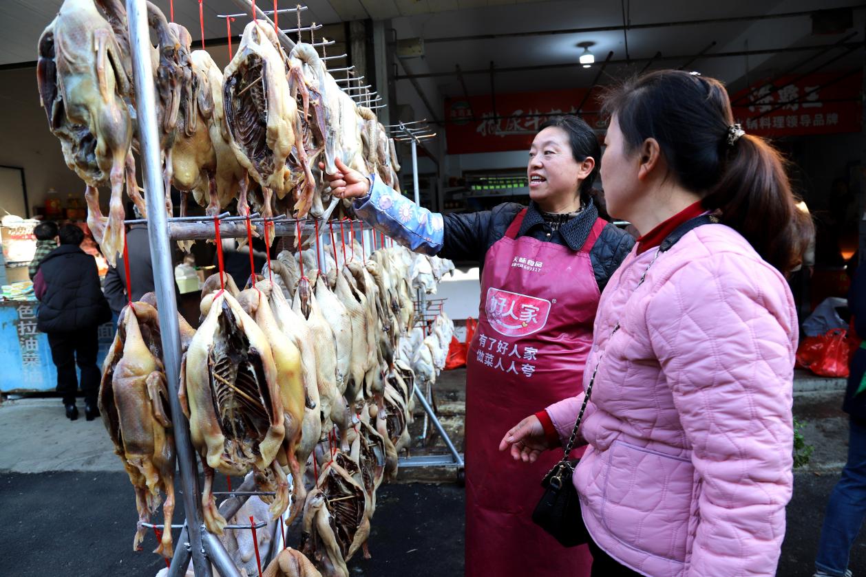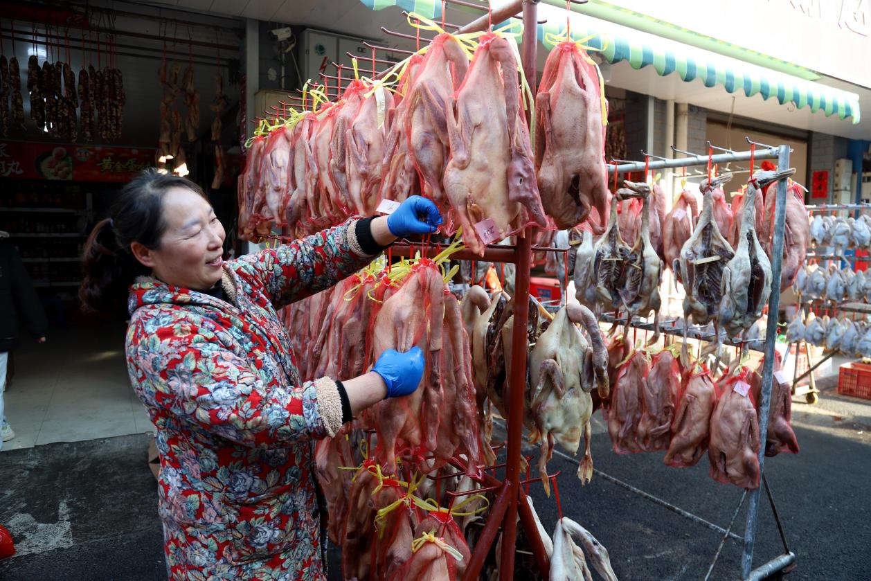12月2日,在高淳区桠溪街道永兴农贸市场内,商户们正在店门前晾挂咸鹅咸鸡等准备销售。