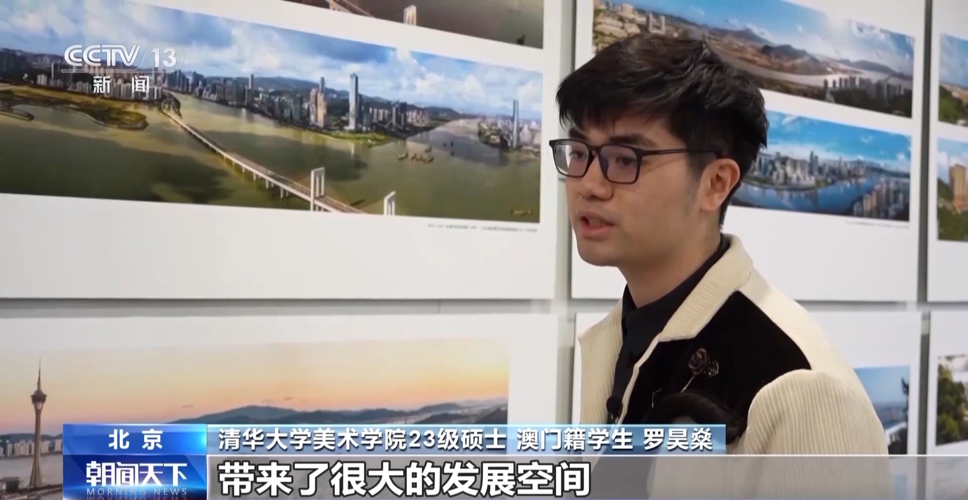 清华大学美术学院23级硕士 澳门籍学生 罗昊燊:我家就在老城区这块,从小在这里长大,这么多年还保留了澳门原来的文化色彩。主要是发展周边的一些区域。我也看着周围从荒芜空地,发展成很多高楼大厦。它的建设为我们年轻人带来了很大的发展空间。