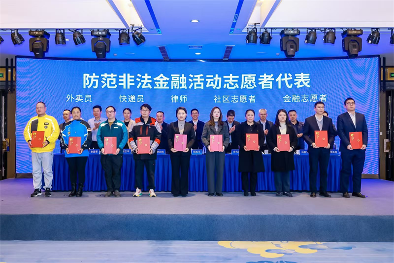 活动现场,江苏省委金融办、人民银行江苏省分行、江苏金融监管局、江苏证监局签署《防范非法金融活动合作备忘录》,5家省属金融企业共同发布《防范非法金融活动倡议书》,并为基层社会治理网格员、金融网点从业人员优秀代表颁发证书,为防非志愿者代表颁发聘书,为举报人发放奖金。