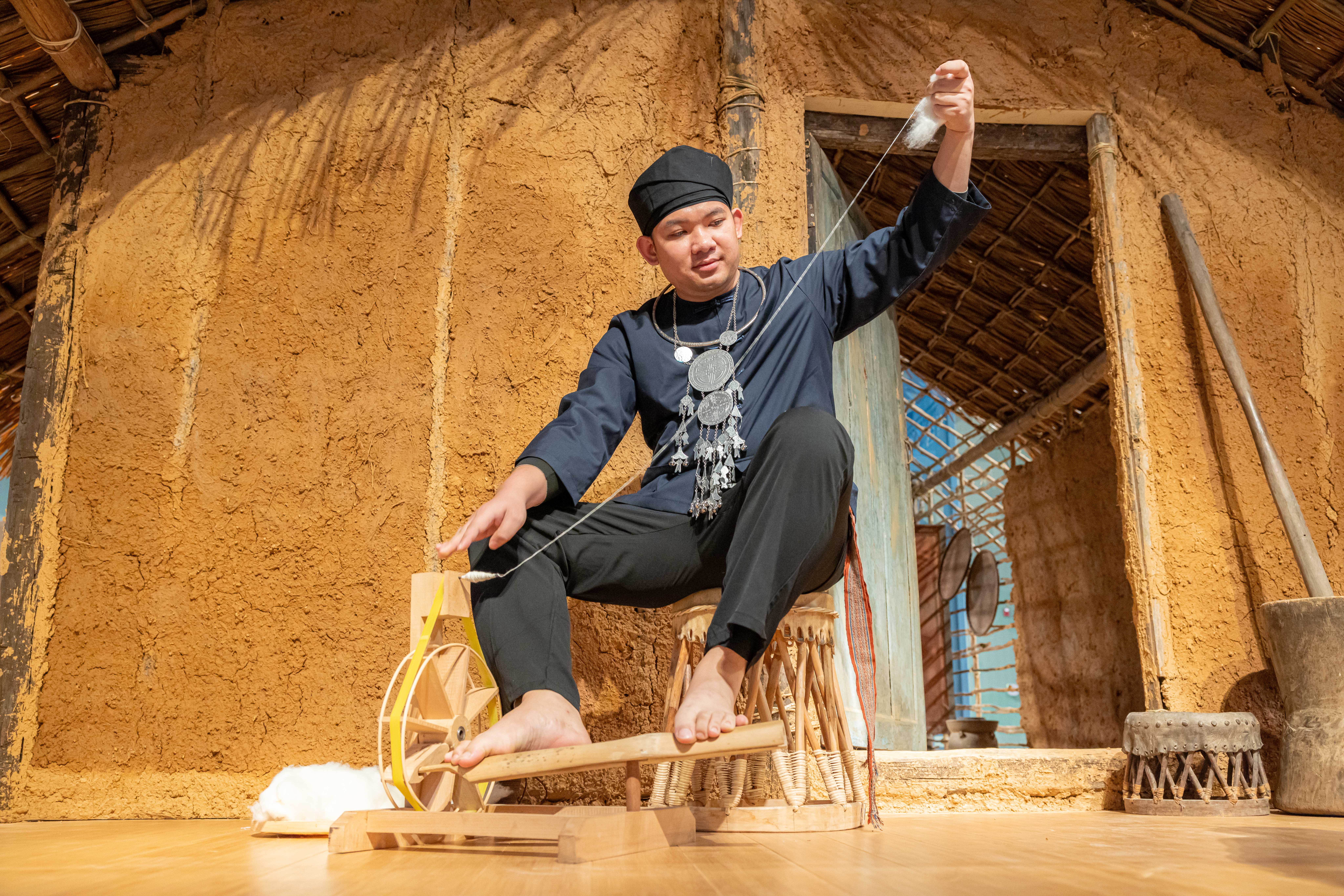 现场还有非遗传承人演示,并搭建了船型屋,把黎族人民的生活场景搬进展馆。漫步展厅可以看到,多位非遗传承人、土生土长的黎族织娘在现场展示黎锦的纺、染、织、绣技艺。她们手法娴熟,动作流畅,每一个步骤都透露出深厚的文化底蕴和对传统工艺的匠心。腰织机上,五彩斑斓的线团交织成一幅幅生动的黎族图腾,黎锦在她们手中逐渐成形,仿佛讲述着一个个古老的传说。