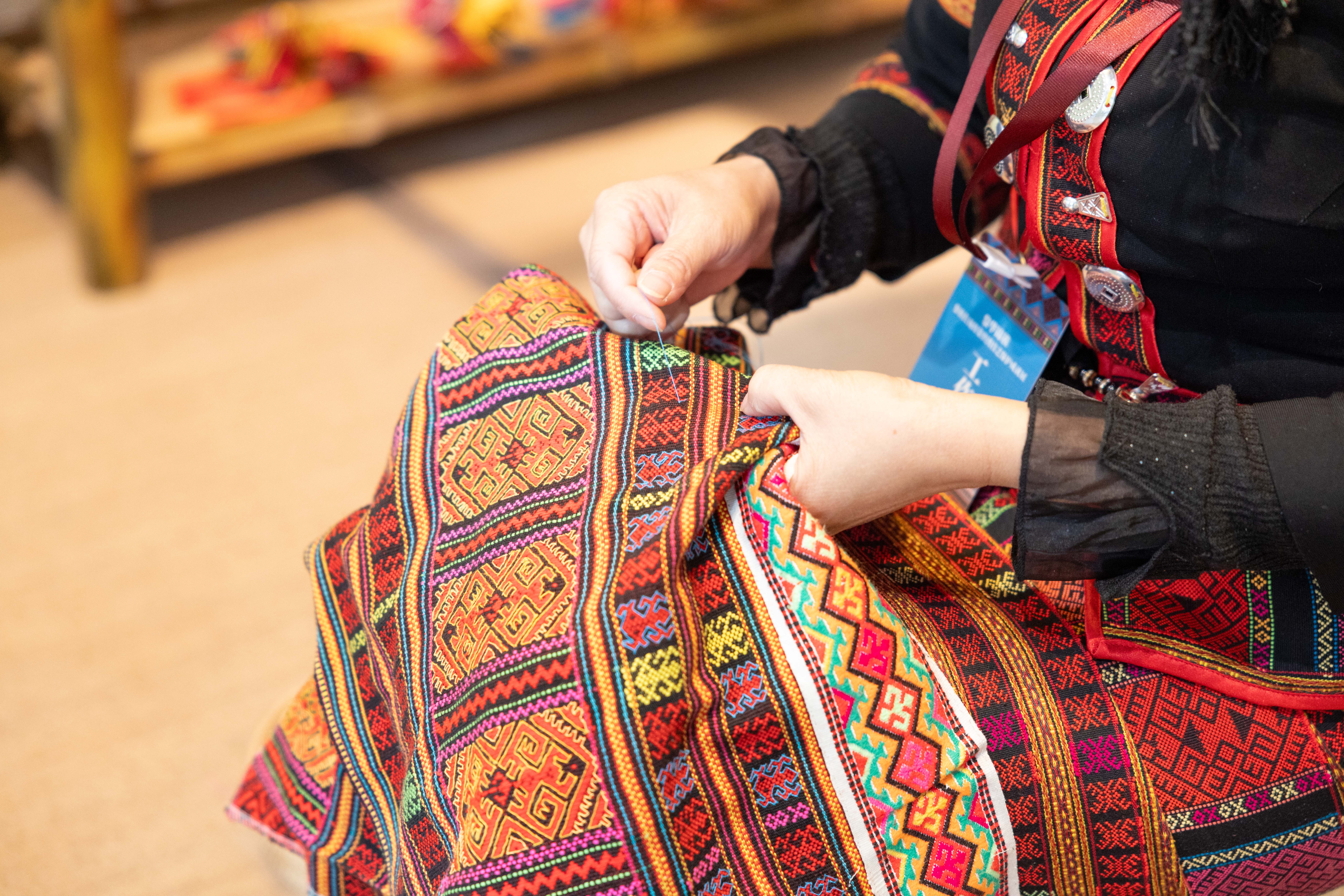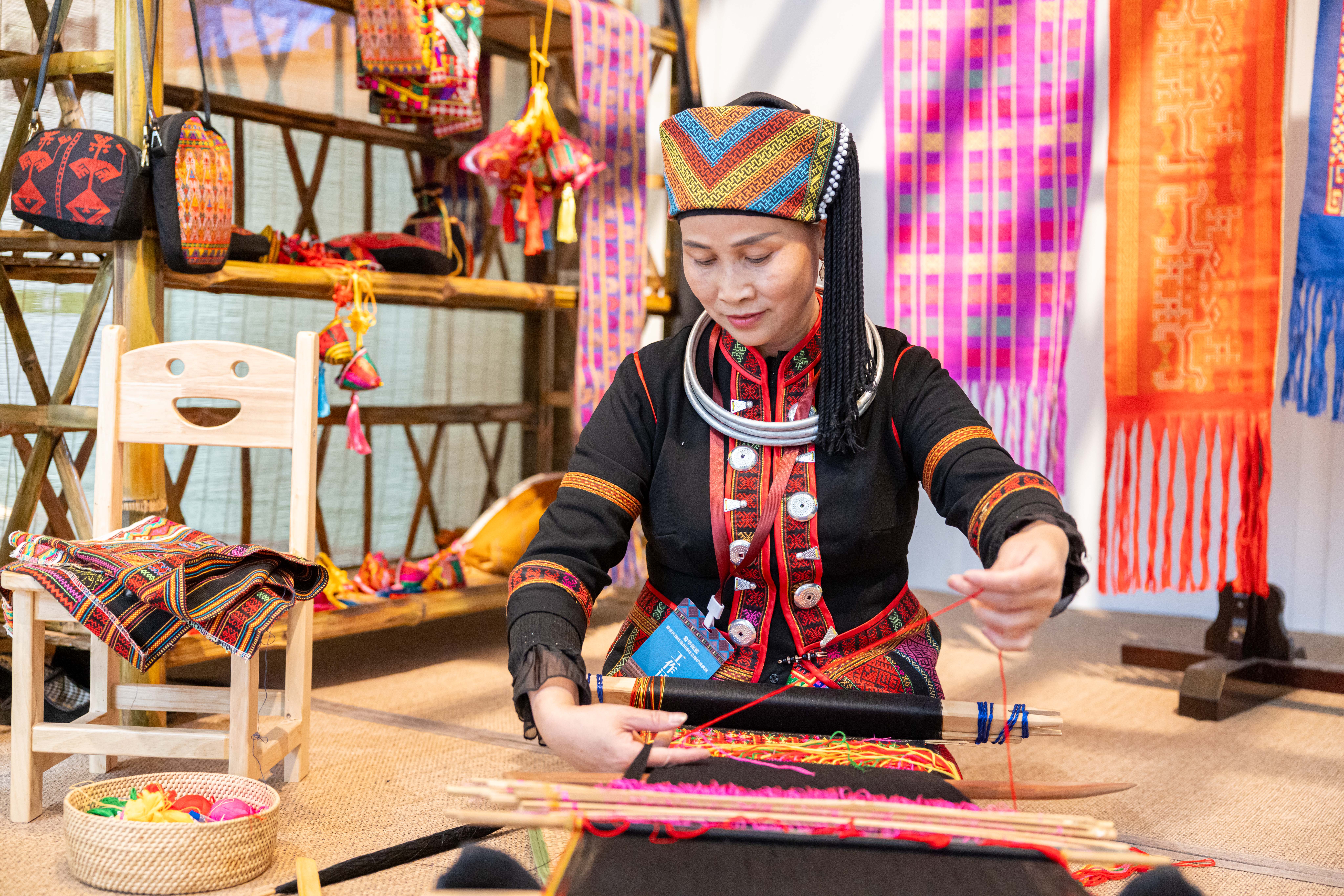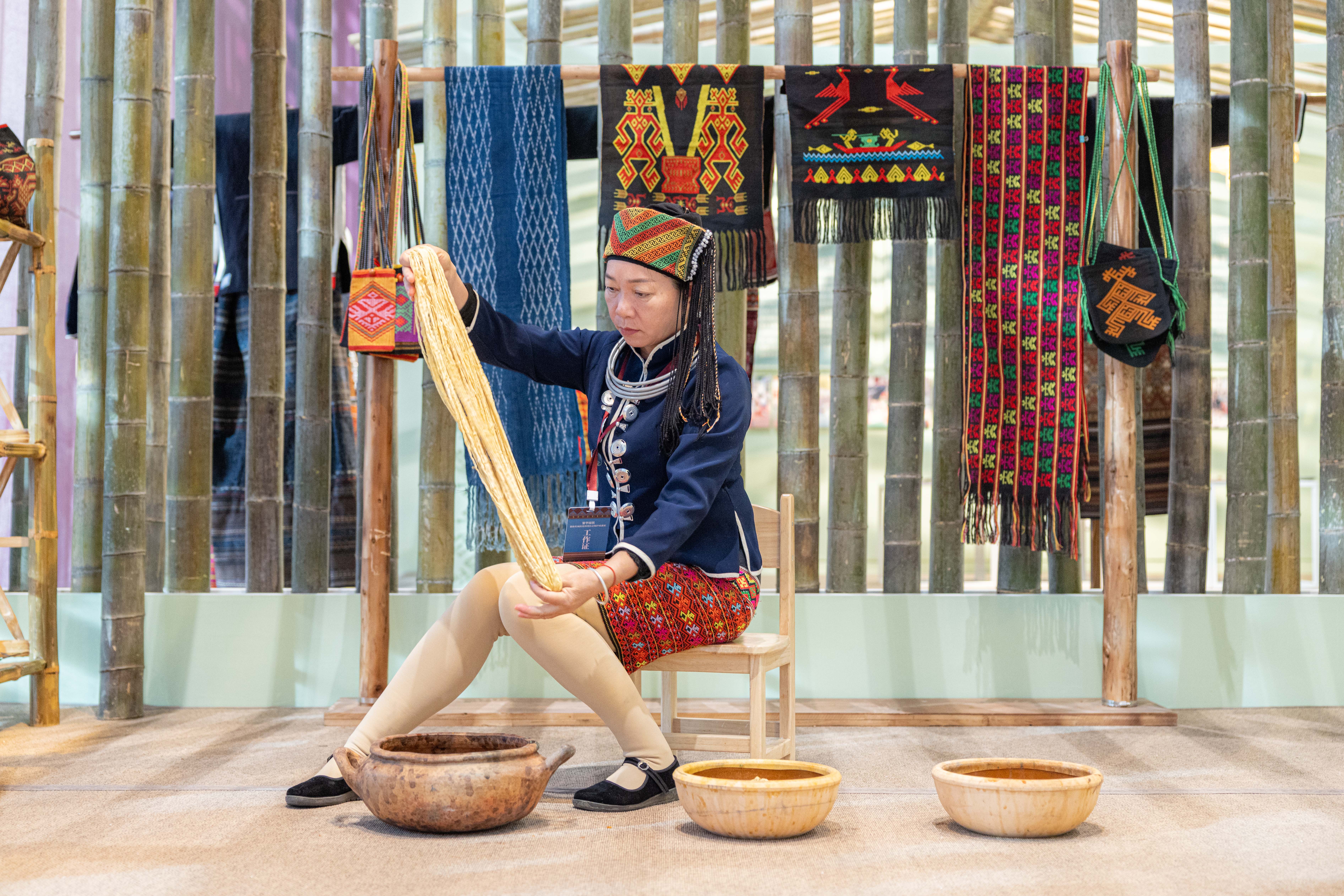 黎族传统纺染织绣技艺传承人在展览现场展示技艺。省旅游和文化广电体育厅供图
