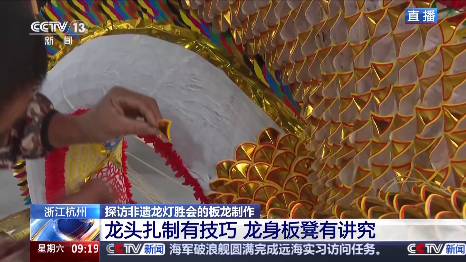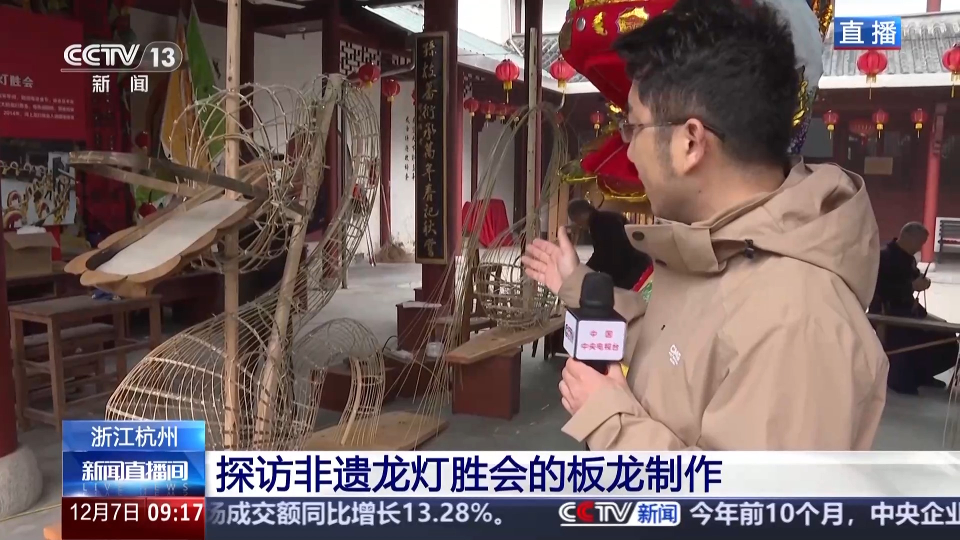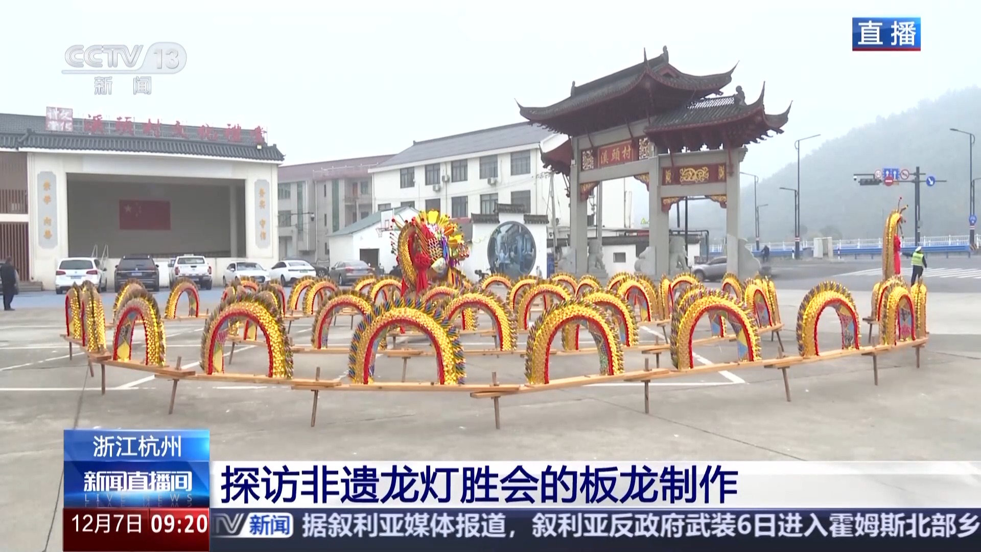 总台记者 夏周:现在我在河上镇溪头村的傅氏宗祠,这里就是河上板龙的生产车间,非遗技艺制作人正在纯手工制作当中。而且今年的制作时间从11月初就开始了,相较往年提前了一个半月。