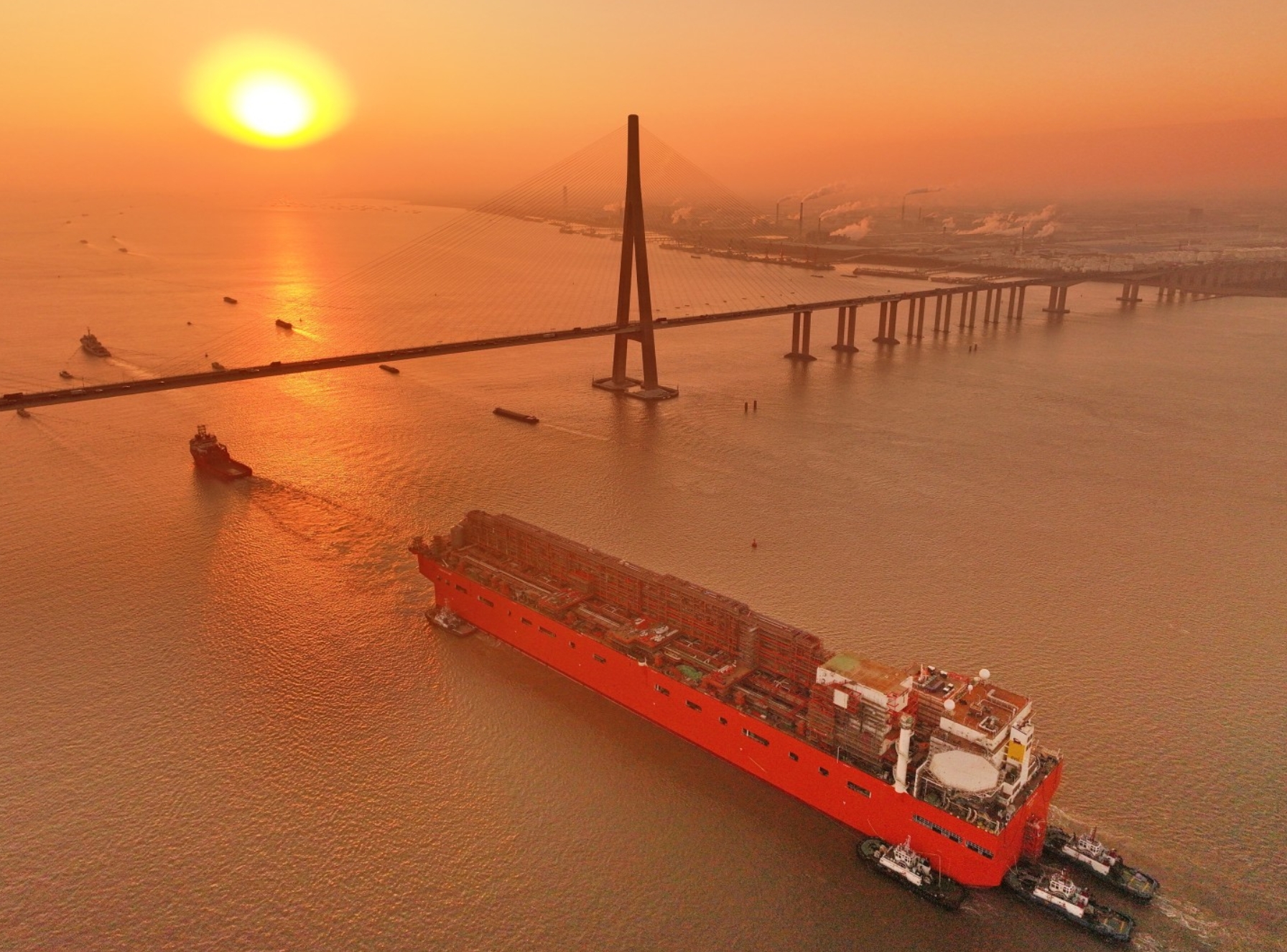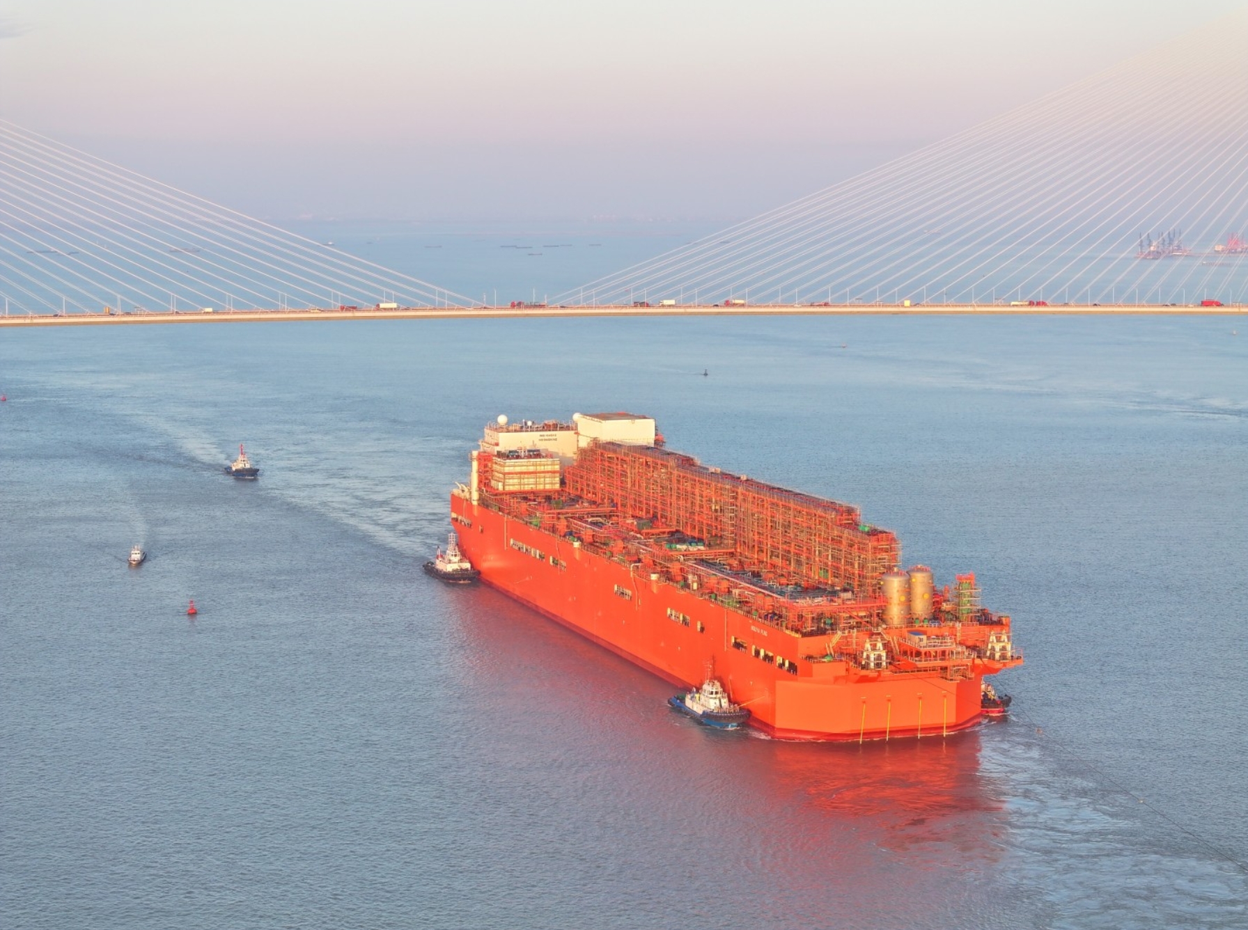 12月9日,我国首座大型浮式天然气液化装置“NGUYA FLNG”轮从南通开发区顺利拖航出江,将在浙江舟山进行上部模块安装、集成和调试。