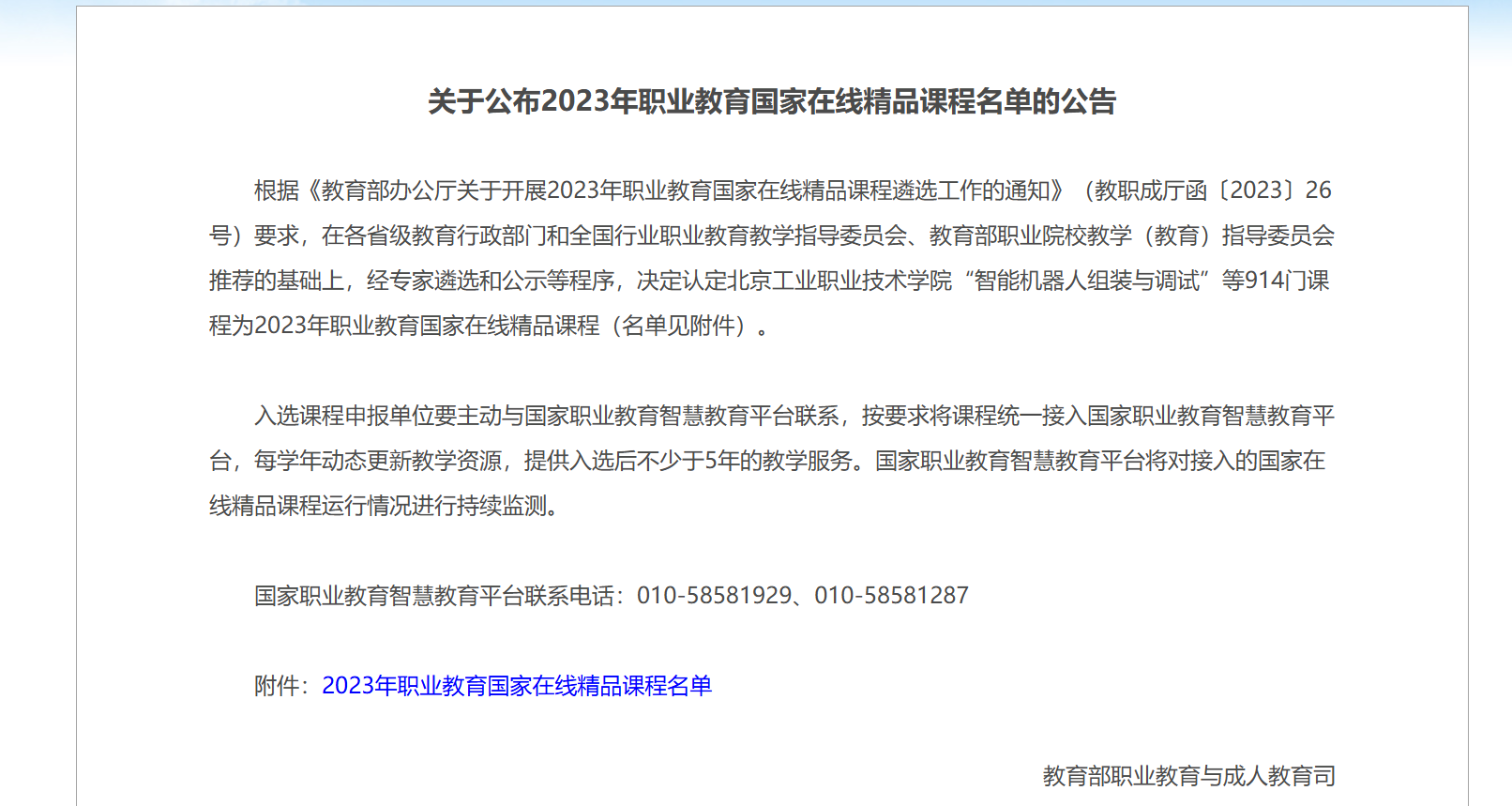 12月9日,教育部公布2023年职业教育国家在线精品课程名单。在各省级教育行政部门和全国行业职业教育教学指导委员会、教育部职业院校教学(教育)指导委员会推荐的基础上,经专家遴选和公示等程序,决定认定北京工业职业技术学院“智能机器人组装与调试”等914门课程为2023年职业教育国家在线精品课程。