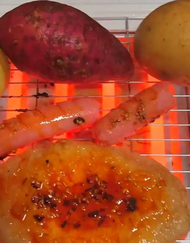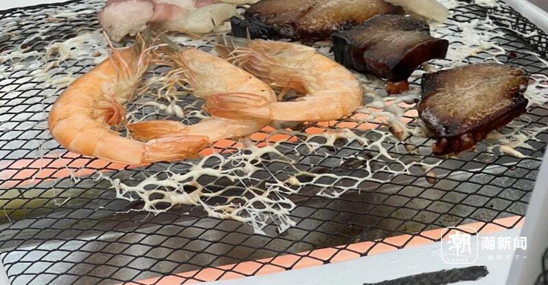 电暖器打开后,消防员使用测温枪对设备内部进行测温。温度计显示,电暖器打开1分钟后,设备内部的发热管中心温度达到了600℃。大约5分钟,放在电暖器表面的虾、肉等就熟了,猪肉和腊肉在高温的作用下开始冒油。