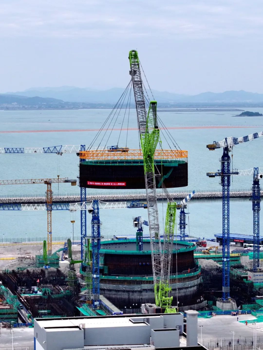 2024年12月10日10时16分,随着2000吨履带吊缓缓落钩,漳州核电3号机组钢衬里模块四顺利吊装就位,吊装过程安全、质量受控。3号机组钢衬里模块四内径46.8米,整体高度9.96米,就位标高19.955米,起吊总重量约221.406吨,包括钢衬里筒体6段和7段、贯穿和非贯穿锚固件等物项。