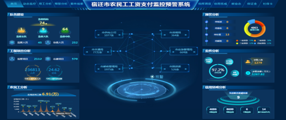 宿迁市“探索‘数字化’治理保障民生服务企业发展中应用”,入选城市治理领域赛道案例。为解决外来务工人员“讨薪难”,宿迁开发农民工工资支付监控预警系统,基于大数据、云计算等网信技术,汇聚人社、住建等近30个部门的4亿余条数据,打造动态监控、用工分析、预警分析等9大应用模块,形成“一个中心+两大平台+三级应用”立体式防护网络,欠薪问题“事前预防、事中监督、事后处理”,形成治理欠薪“一网统管”新格局。
